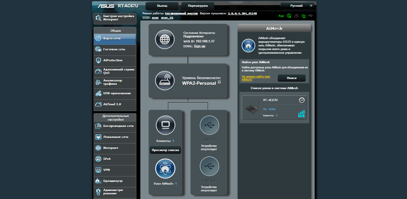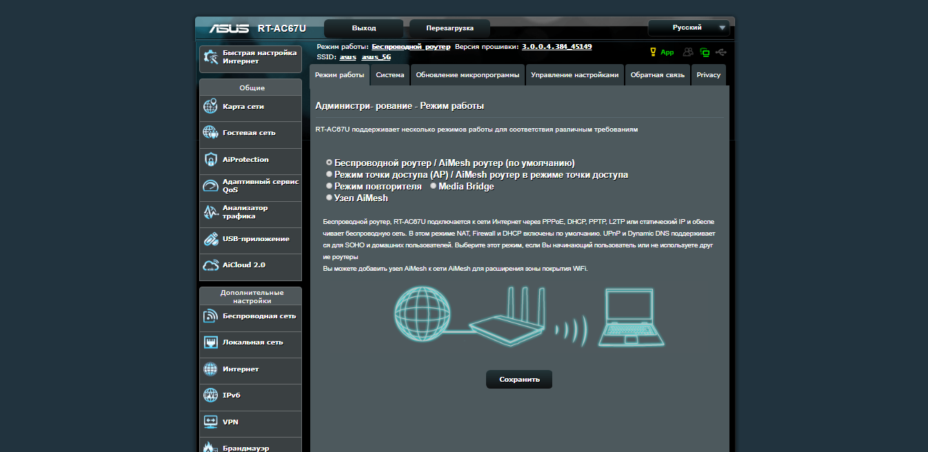 Эта модель роутера, как и все модели ASUS с поддержкой AiMesh, кроме основных режимов (роутер, точка доступа, повторитель, Media Bridge) имеют еще один — так называемый узел AiMesh. Этот режим автоматически включается в момент настройки на зависимых от основного роутера устройствах.