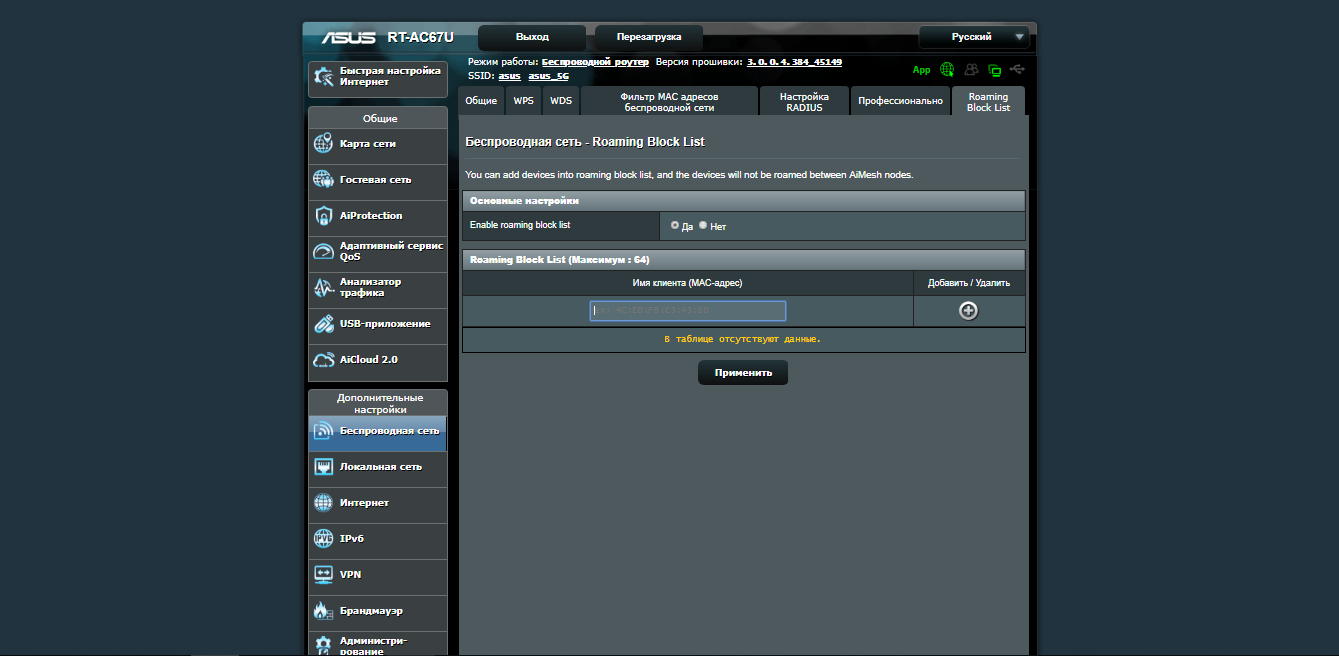 Для технологии AiMesh имеется дополнительная опция во вкладке управления беспроводными сетями под названием Roaming Block List. В ней можно заблокировать конкретного беспроводного клиента по MAC-адресу таким образом, чтобы при затухании сигнала, его не переключало на новый узел Mesh-сети. В остальном никаких дополнительных настроек для AiMesh сети здесь нет.