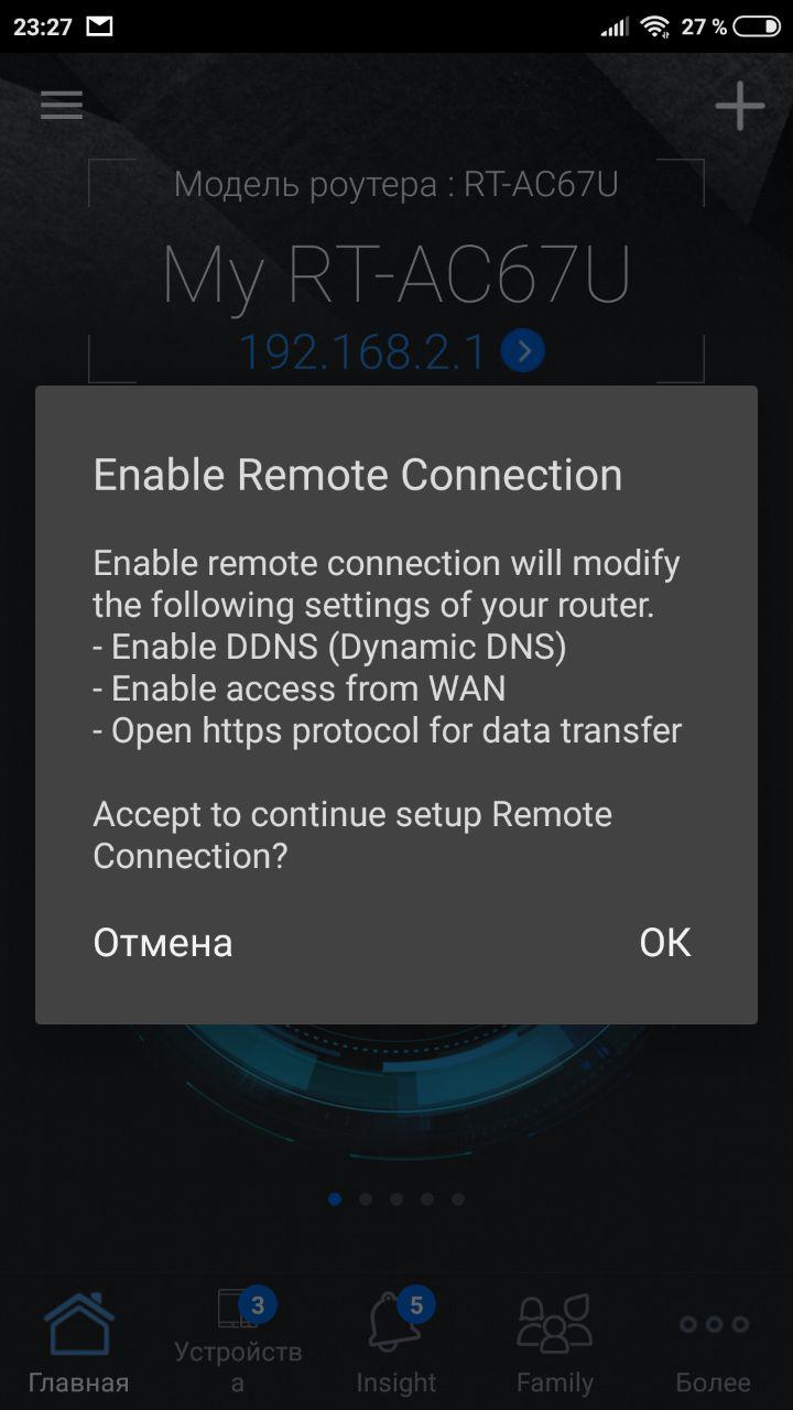 Приложение посоветует включить возможность удаленного управления роутером через облачные сервисы ASUS. В этом случае роутер будет доступен по автоматически сгенерированному адресу вида ABDE453495345.asuscomm.com