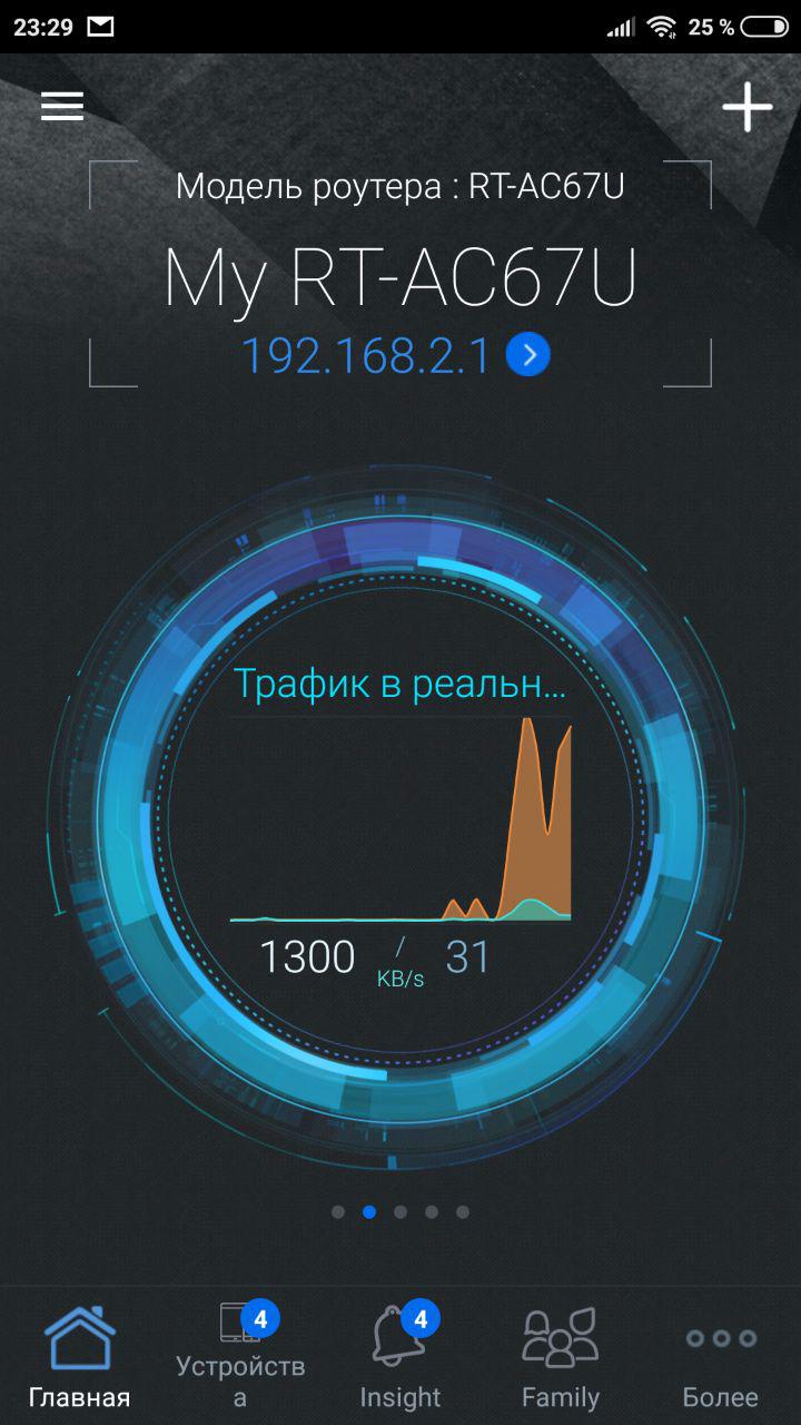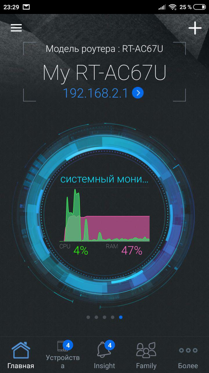 На главном экране приложения выводится подробная информация о подключенных устройствах, текущем трафике на роутере и загрузки CPU/RAM.