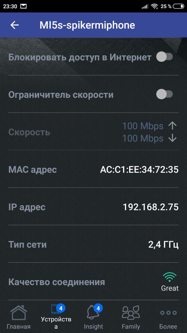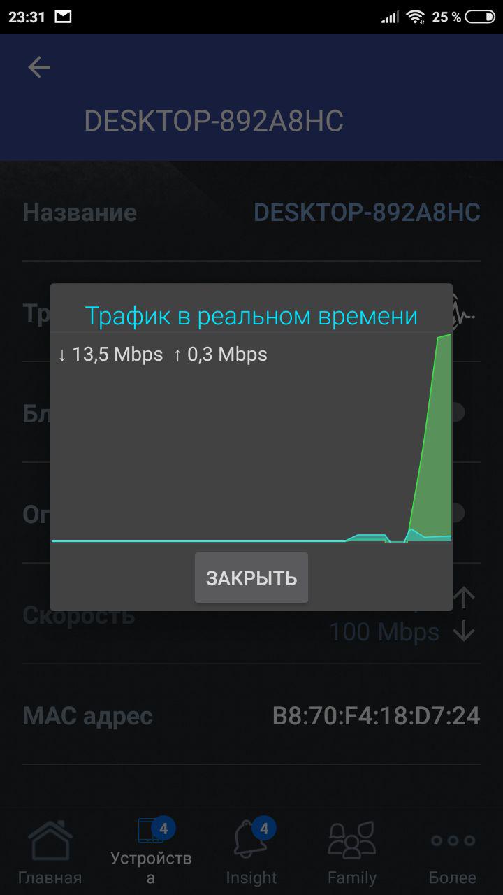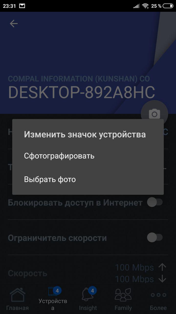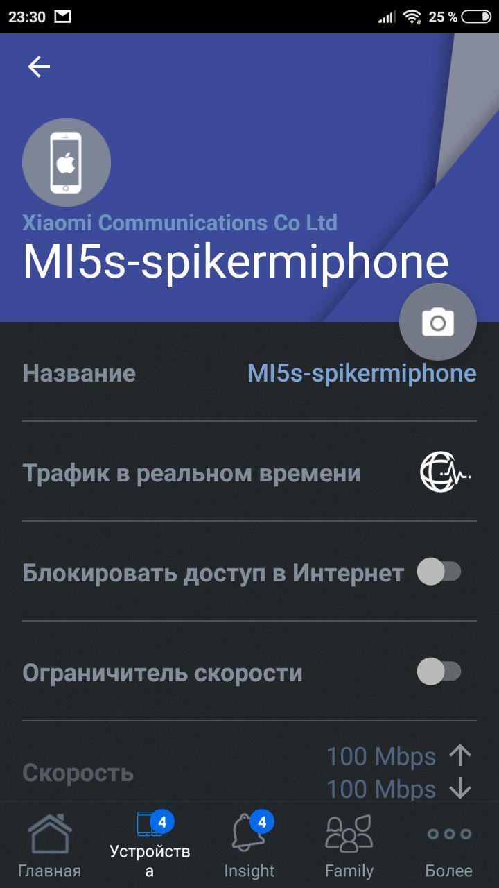 Можно посмотреть детализацию на каждое подключенное устройство, его текущий трафик и тип подключения, а также задать фотографию и название.