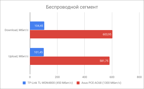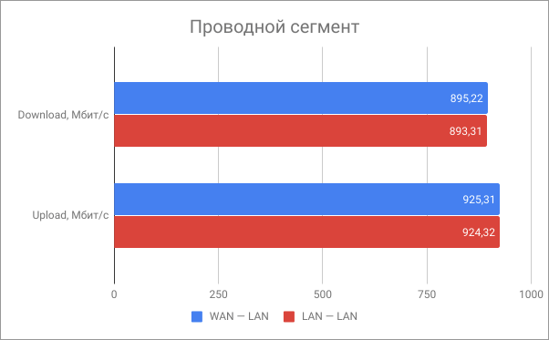 Проводной сегмент показывает отличные результаты. Сказывается наличие гигабитного коммутатора и мощного процессора — тут затыков почти нет.