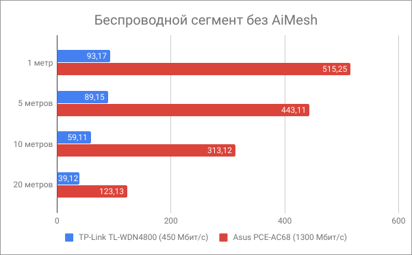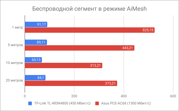Беспроводной сегмент с AiMesh показывает улучшение качества и скорости соединения причем как в 2,4, так и в 5 ГГц диапазоне.