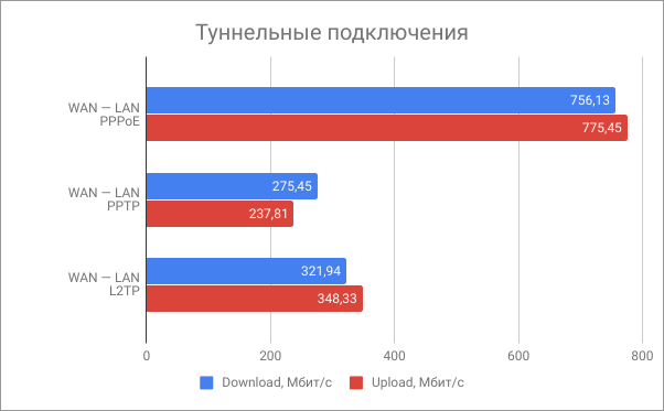 Что касается туннельных подключений, то тут также особенных вопросов нет. Производительности процессора хватает для маршрутизации в современных сетях провайдеров при различных типах подключения.