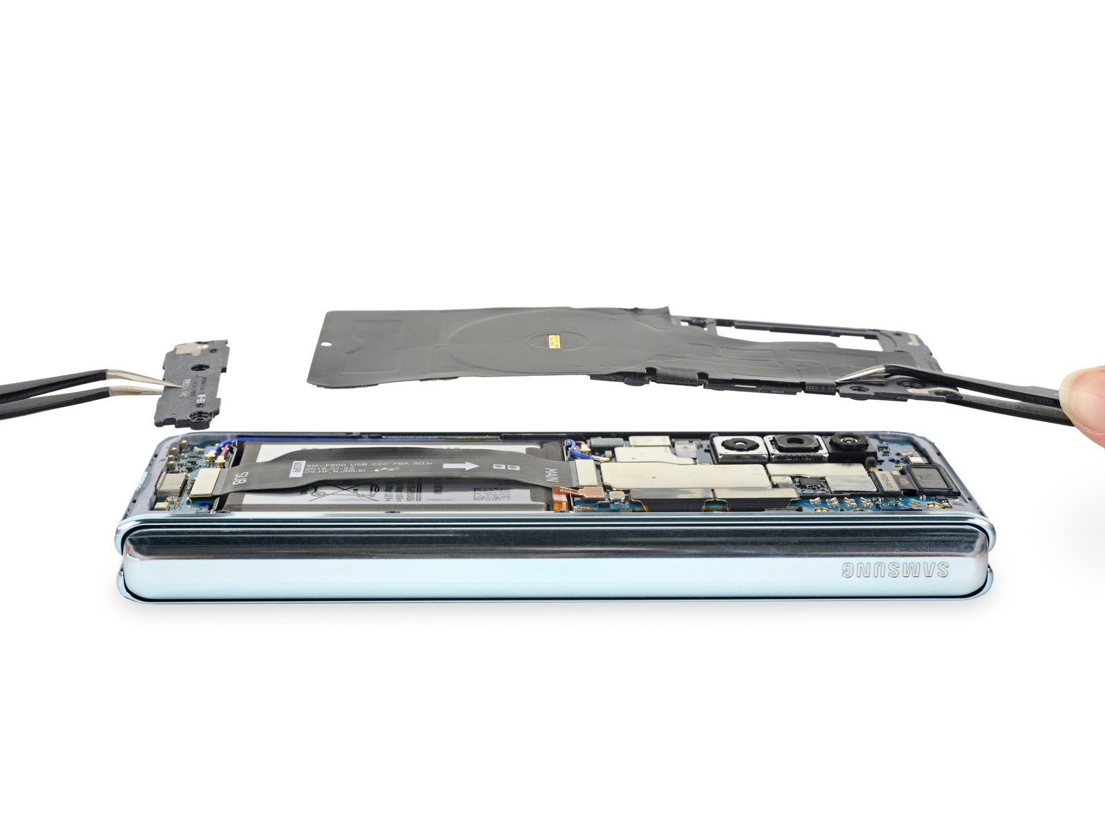 - Шарнирный механизм выглядит хорошо сконструированным и долговечным, но содержит гибкий кабель, который соединяет левую половину с правой. Хотя шарнир, согласно заявлению Samsung, может выдержать до 200 000 сгибаний (около 5 лет работы), iFixit считает, что сам кабель может не проработать так долго.