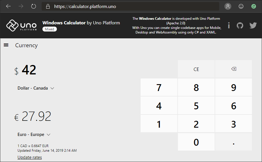 Uno Calculator выглядит точно так же, как и в Windows 10. Это не удивительно, ведь Uno является платформой, которая позволяет создавать кроссплатформенные приложения с использованием единой базы кода. Разработчики перенесли калькулятор Windows на C# и Uno и опубликовали его на Github. Подробнее о том, как команда Uno портировала калькулятор на свою платформу, можно прочитать в блоге компании.