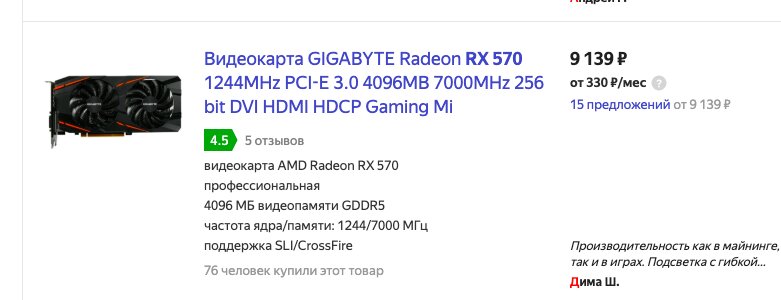 Теперь пришло время самого важного элемента игрового компьютера — видеокарты. За графику будет отвечать модель GIGABYTE Radeon RX 570. Изначально выбор пал на GTX 1050 Ti, они примерно одинаковы по цене с RX 570, но проблема в том, что видеокарта от AMD намного мощнее — как при работе с графикой в программах, так и в играх. Прирост FPS у GIGABYTE Radeon RX 570 примерно 20% по сравнению с нереференсной картой GTX 1050 Ti, так что выбор очевиден. Целых 4 ГБ видеопамяти, частота графического ядра 1244 в штатном режиме и 1255 в режиме разгона, шина 256 бит и теплопакет всего 150 Вт — что может быть лучше за девять тысяч рублей?