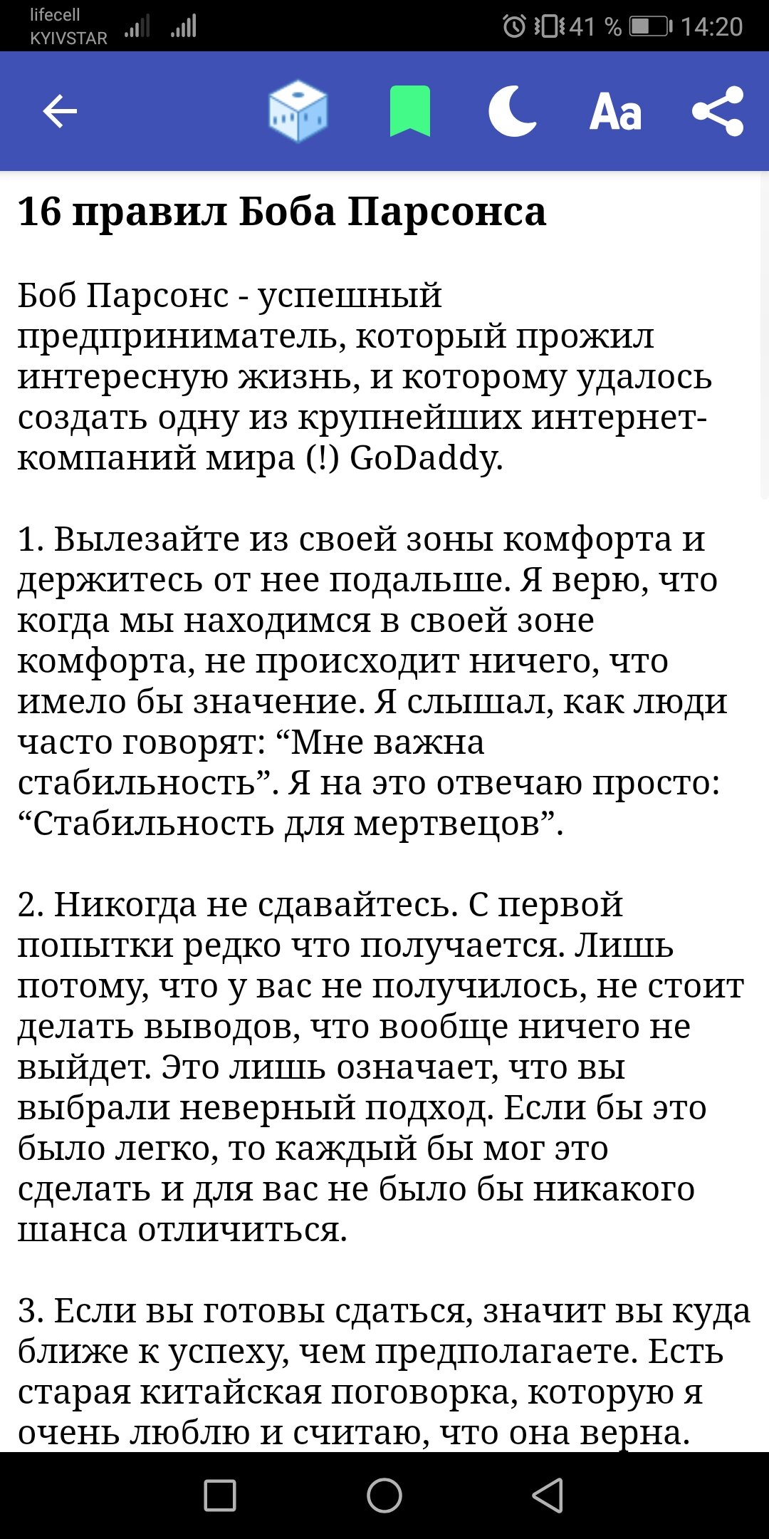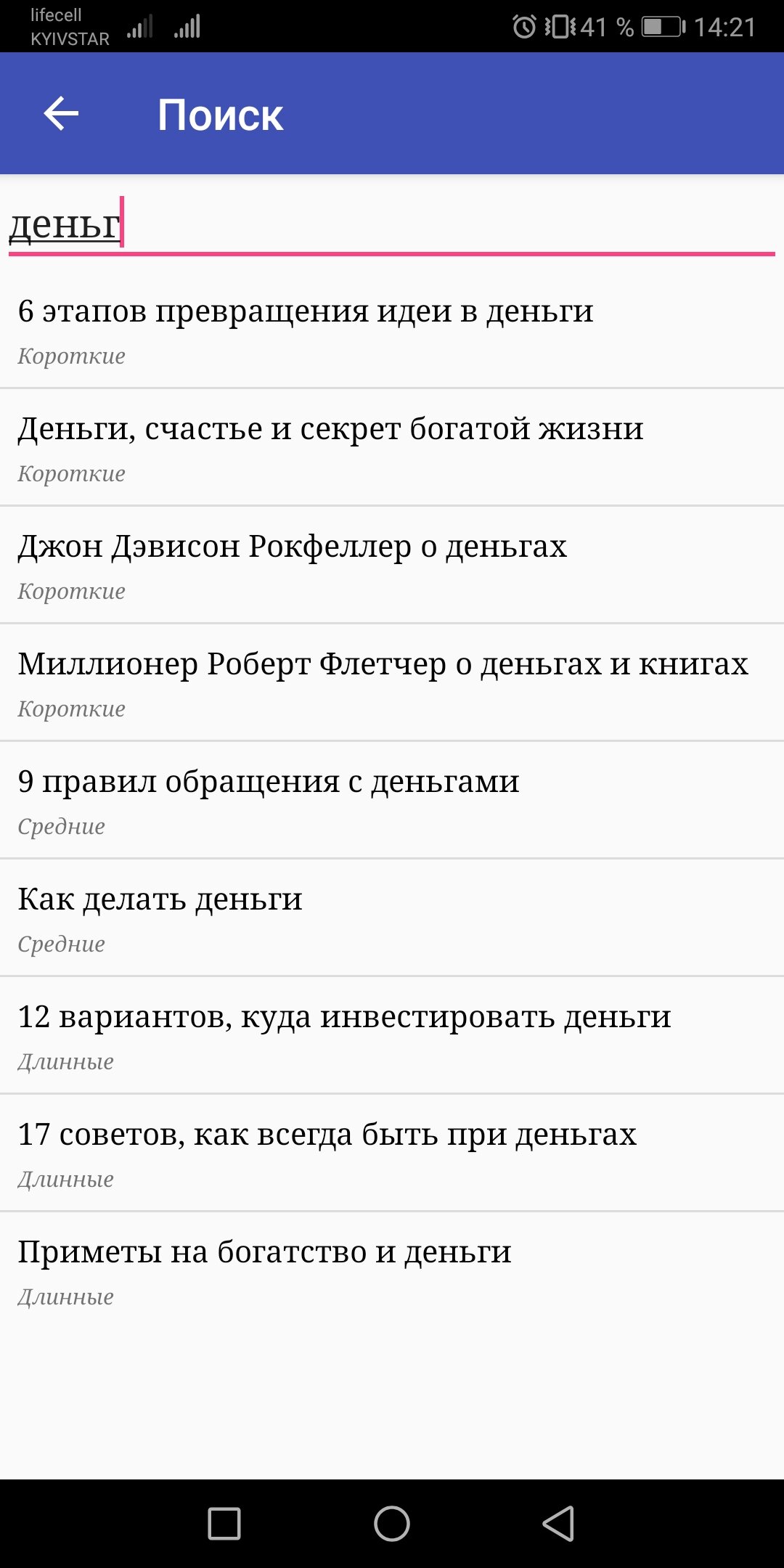 В приложении Успех жизни собраны наиболее интересные мудрые мысли и высказывания, которые раскрывают ключ к успеху. Приложение поддерживает ночной режим и оффлайн режим (без интернета), есть поиск. Понравившиеся высказывания можно добавить в избранное, а также поделиться с друзьями. Приложения запоминает, где вы остановились для каждой категории. Благодаря этому вы сможете позже возобновить чтение с того же места.