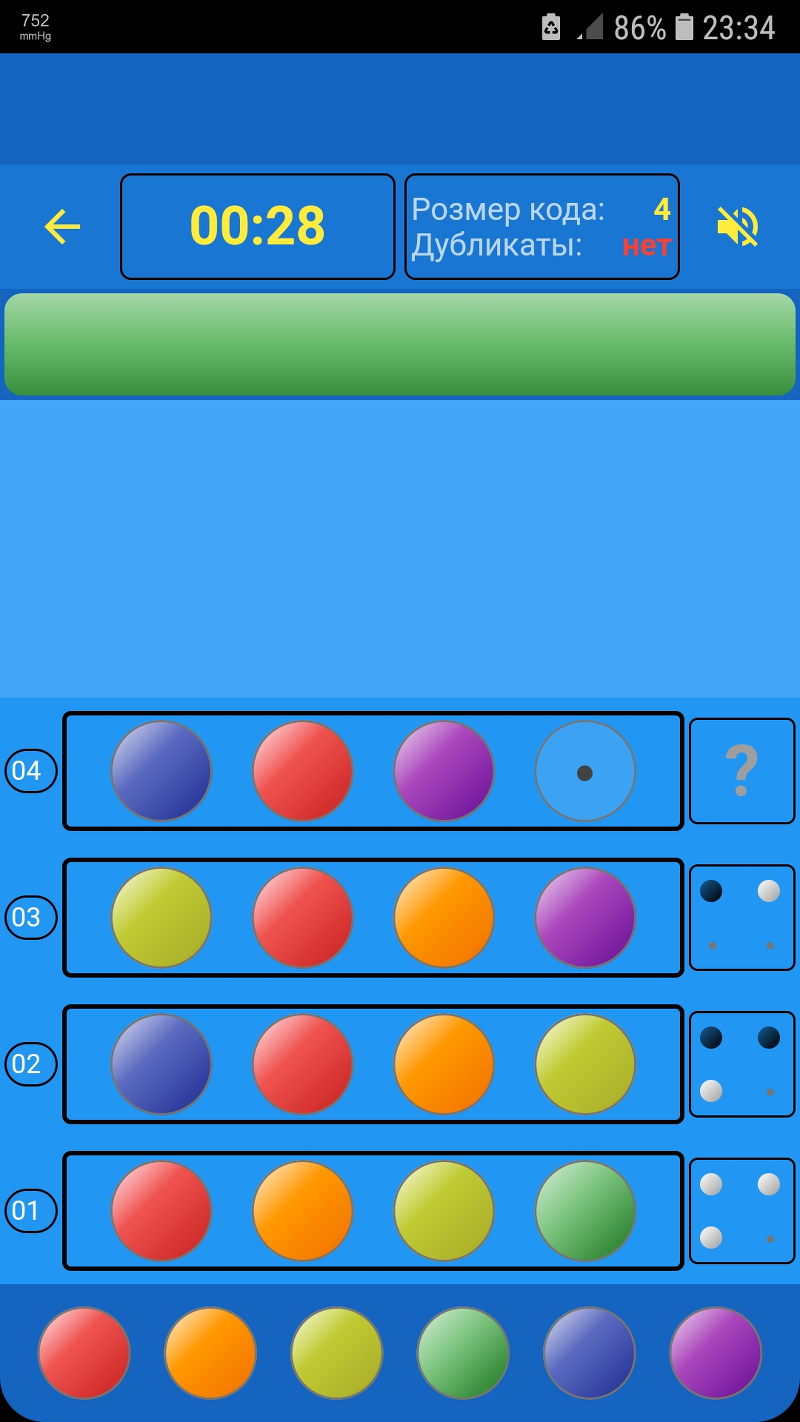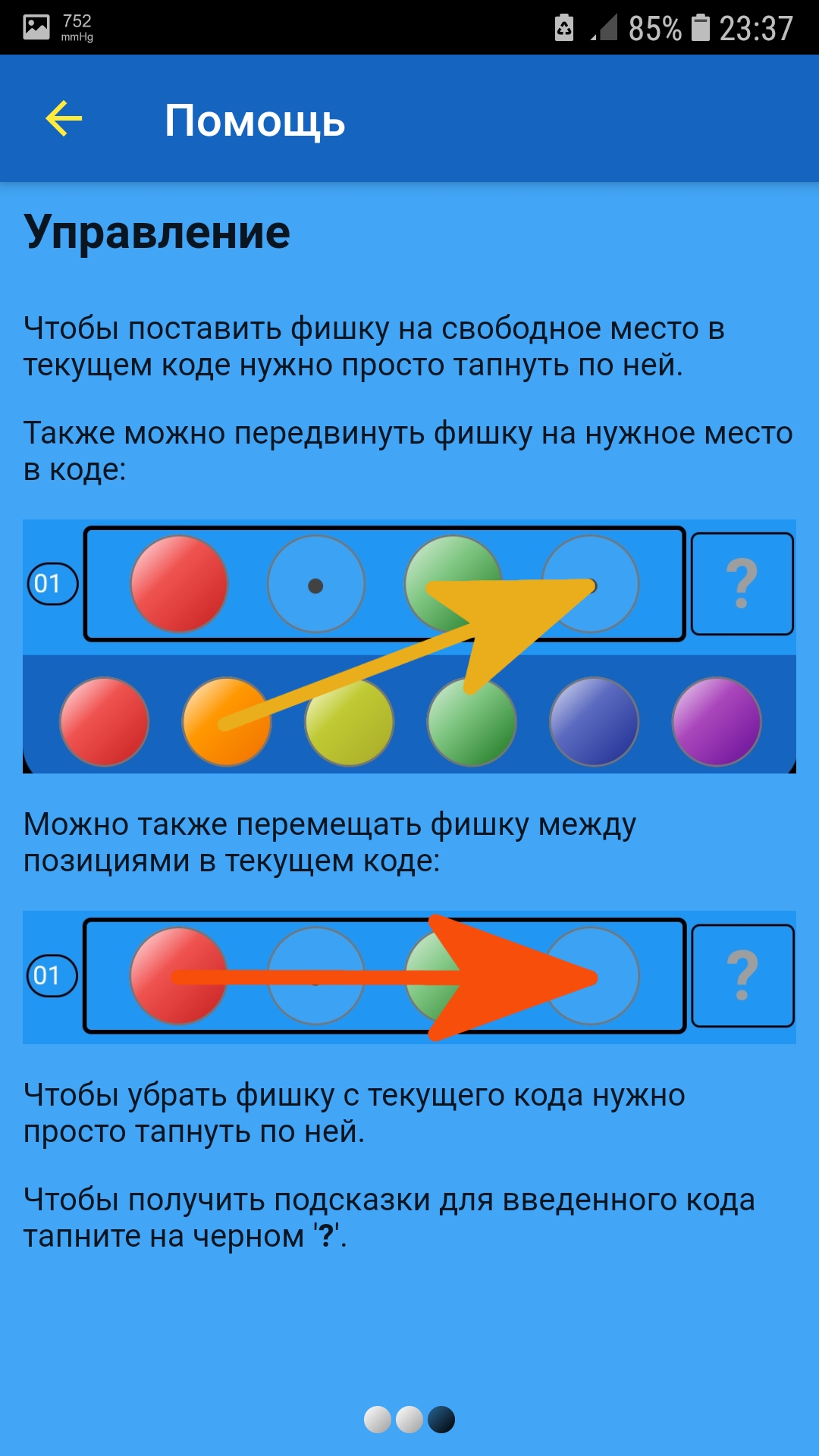 - Белая подсказка означает, что цвет какой-то фишки угадан верно;