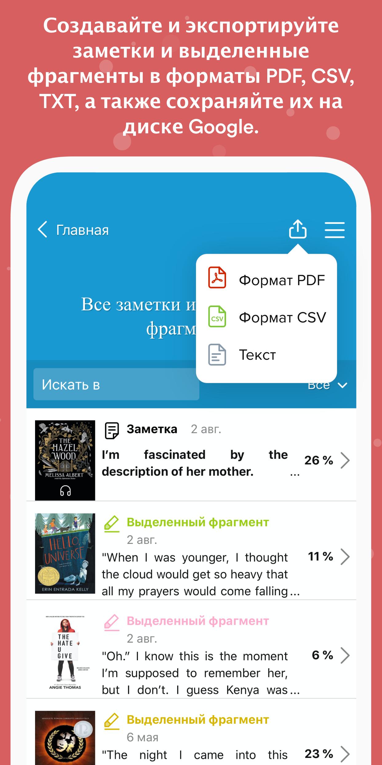 - Создавать и экспортировать заметки и выделенные фрагменты.