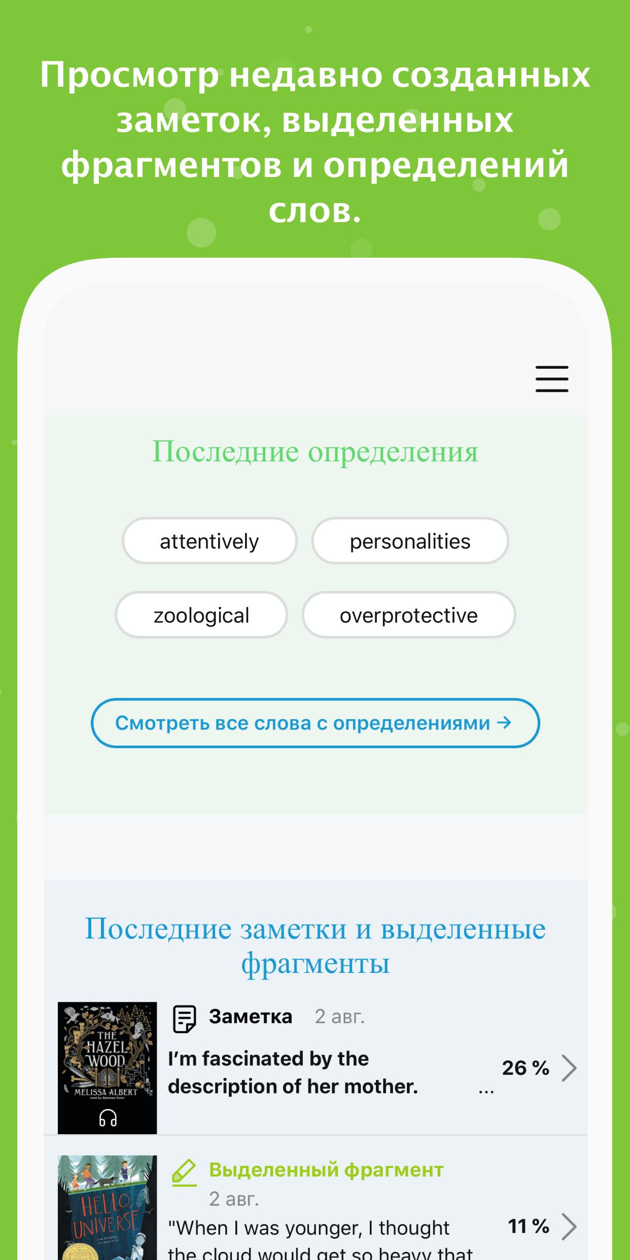 - Смотреть определения слов и просматривать список всех выученных слов.