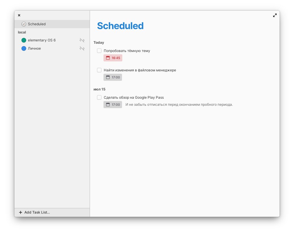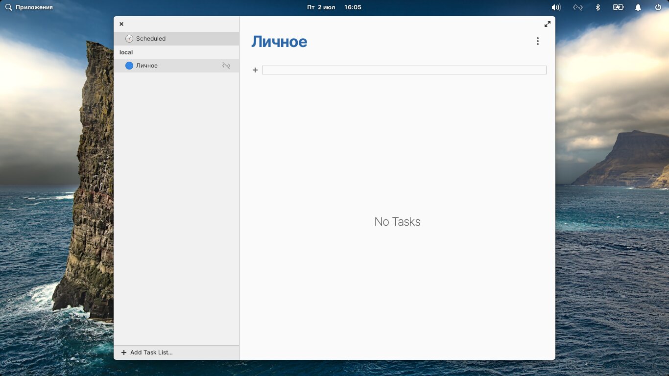 В состав системы было добавлено новое приложение «Задачи» для составления списков задач. Как и другие приложения в этом дистрибутиве, оно создано в духе elementary: простым, минималистичным, без настроек.