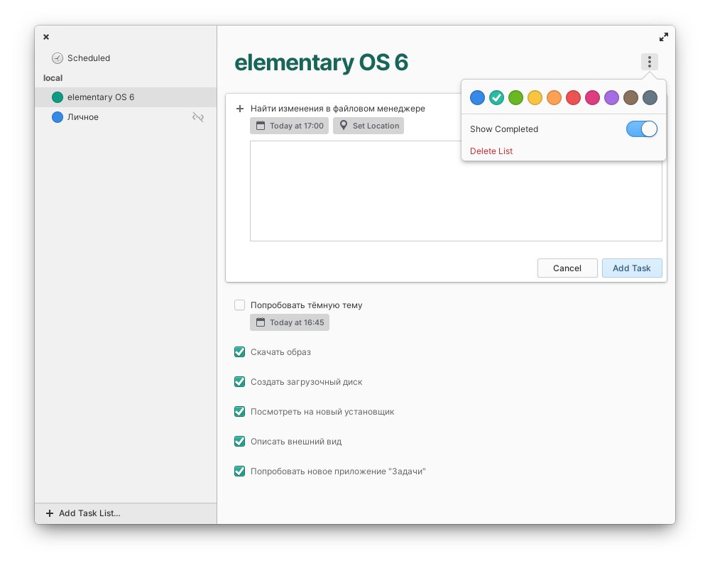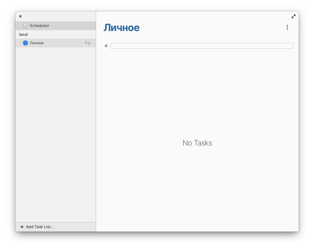 Спискам можно присваивать цветовые метки, задачам — задавать местоположение и дату. Есть синхронизация из онлайн-сервисов через CalDav.