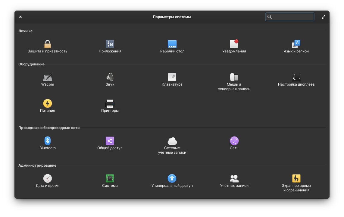 Увеличено взаимодействие тачпада с системой. Например, в «Параметрах системы» можно вернуться на предыдущий экран горизонтальным движением по тачпаду двумя пальцами. Данную функцию реализовали с помощью Handy, библиотеки от Purism для создания мобильных интерфейсов.