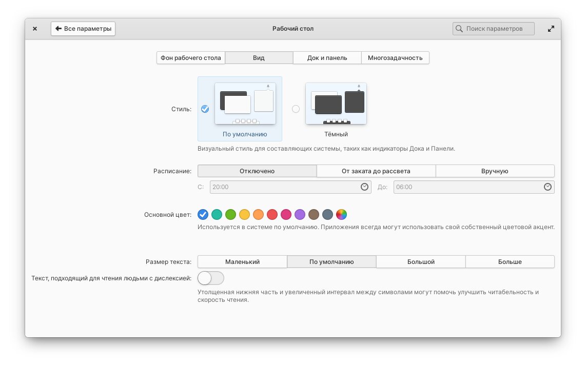 Тёмную тему можно включить в «Параметрах системы», в разделе «Рабочий стол», во вкладке «Вид». Есть возможность настройки автоматической смены темы в назначенное время или при заходе/восходе солнца.
