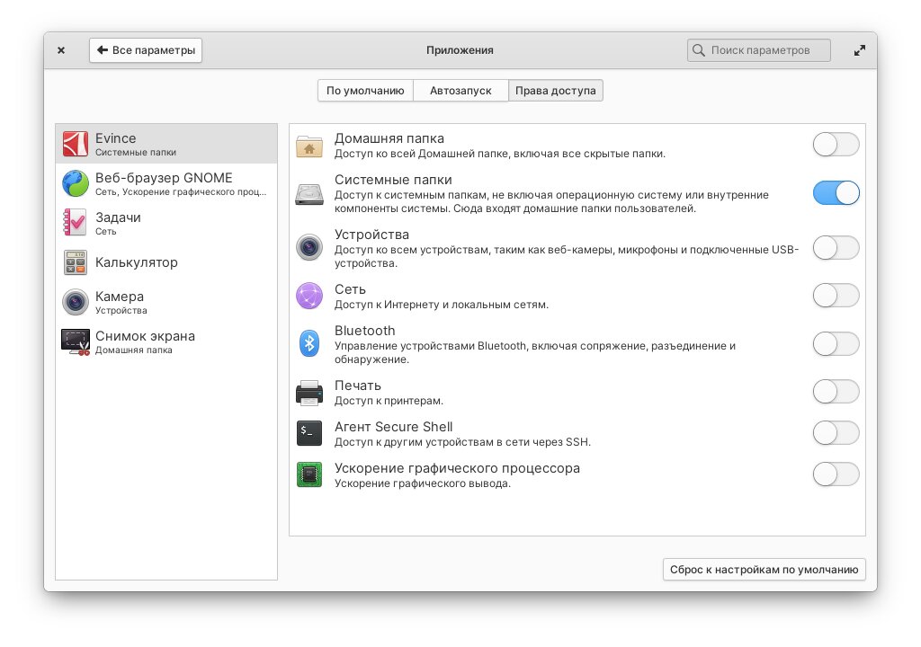 Преимущества Flatpak — изолирование приложений и система разрешений. В разделе настроек «Приложения» появилась новая вкладка «Права доступа», в котором можно разрешить или ограничить Flatpak-приложениям доступ к устройствам, сети, системе и так далее.