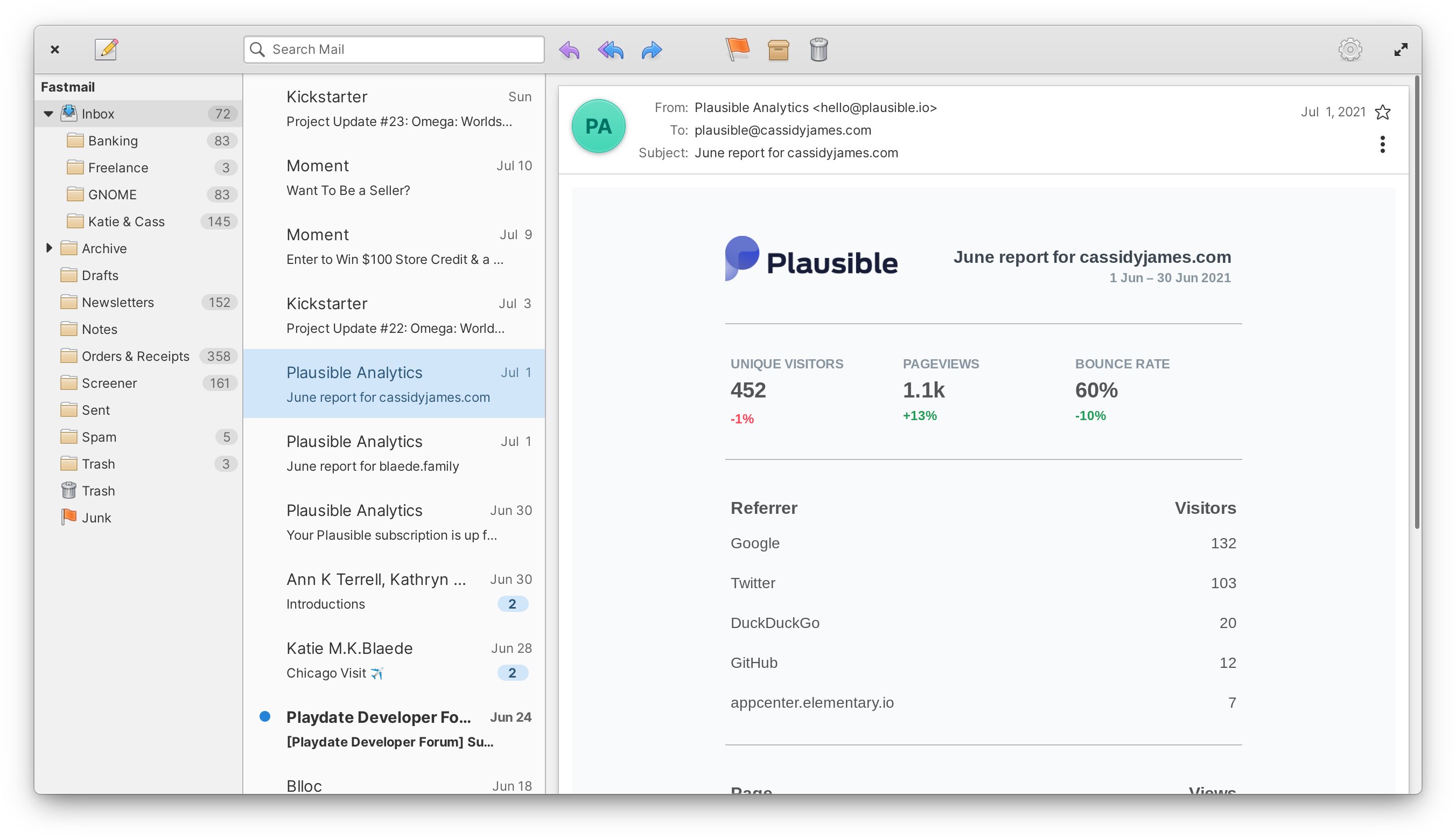 Раньше в поставку шёл почтовый клиент, основанный на Geary. Теперь это новое приложение, написанное с нуля. Как и Geary, оно также использует Evolution Data Server.