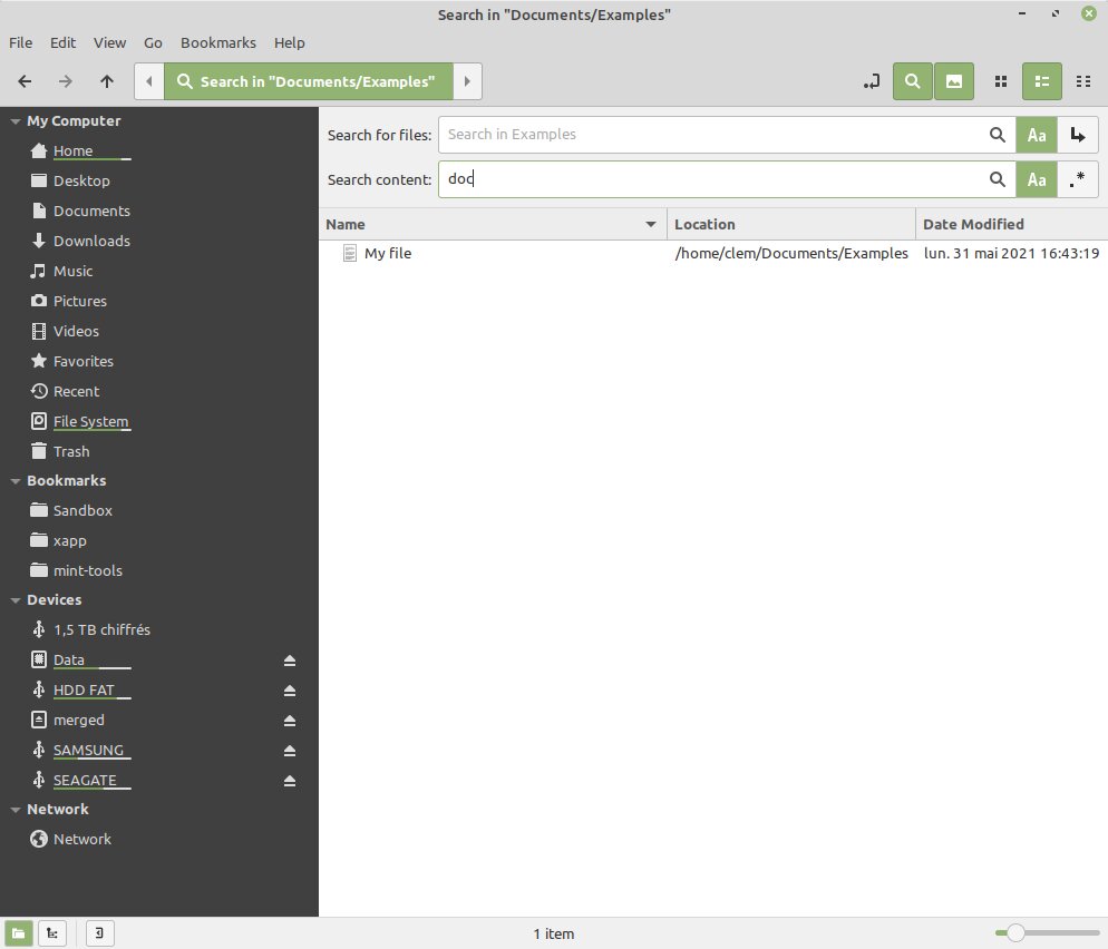 Nemo, файловый менеджер Сinnamon, теперь имеет возможность искать файлы не только по названию, но и по их содержимому. Назначена клавиша F6 для переключения между панелями в двухпанельном режиме. Добавлена опция сортировки избранных файлов перед другими.