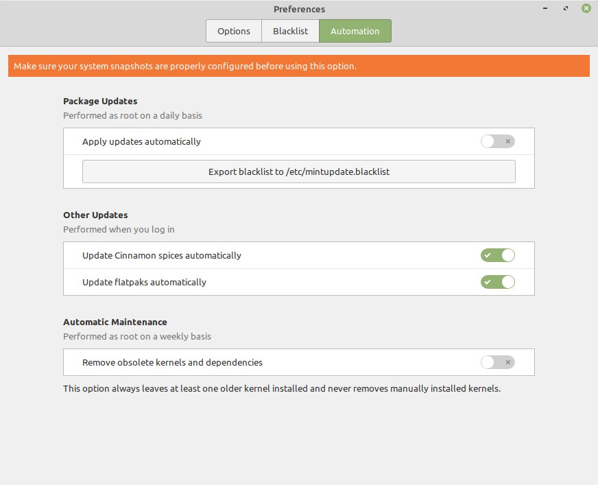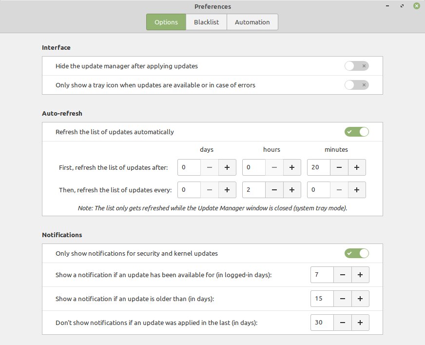 Разработчики утверждают, что реализации в других операционных системах, таких как Windows и macOS, были примерами, которым Linux Mint не хотел следовать. Уведомления можно настроить или отключить, тогда об обновлениях будет оповещать только иконка в трее.