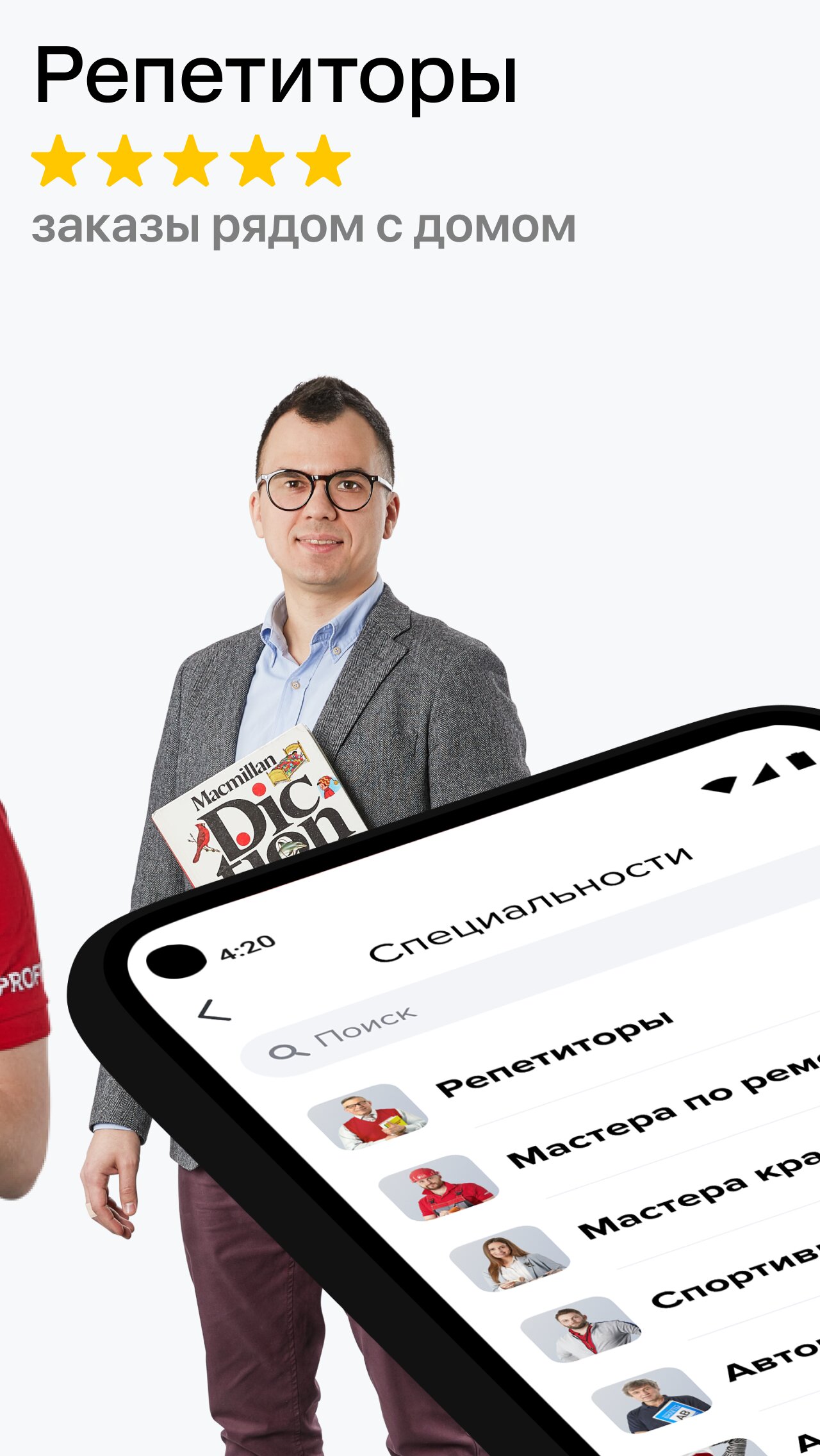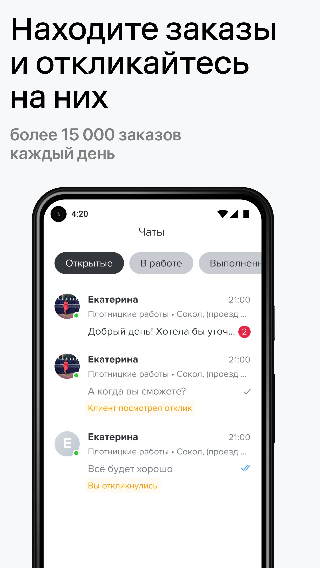 У нас — 900 специальностей. Есть работа для популярных специальностей — например электрик, репетитор, мастер по маникюру. Дело найдётся всем, есть работа и подработка для студентов. Можно выполнять заказы сразу по нескольким специальностям, брать удалённую работу или работу на дому.