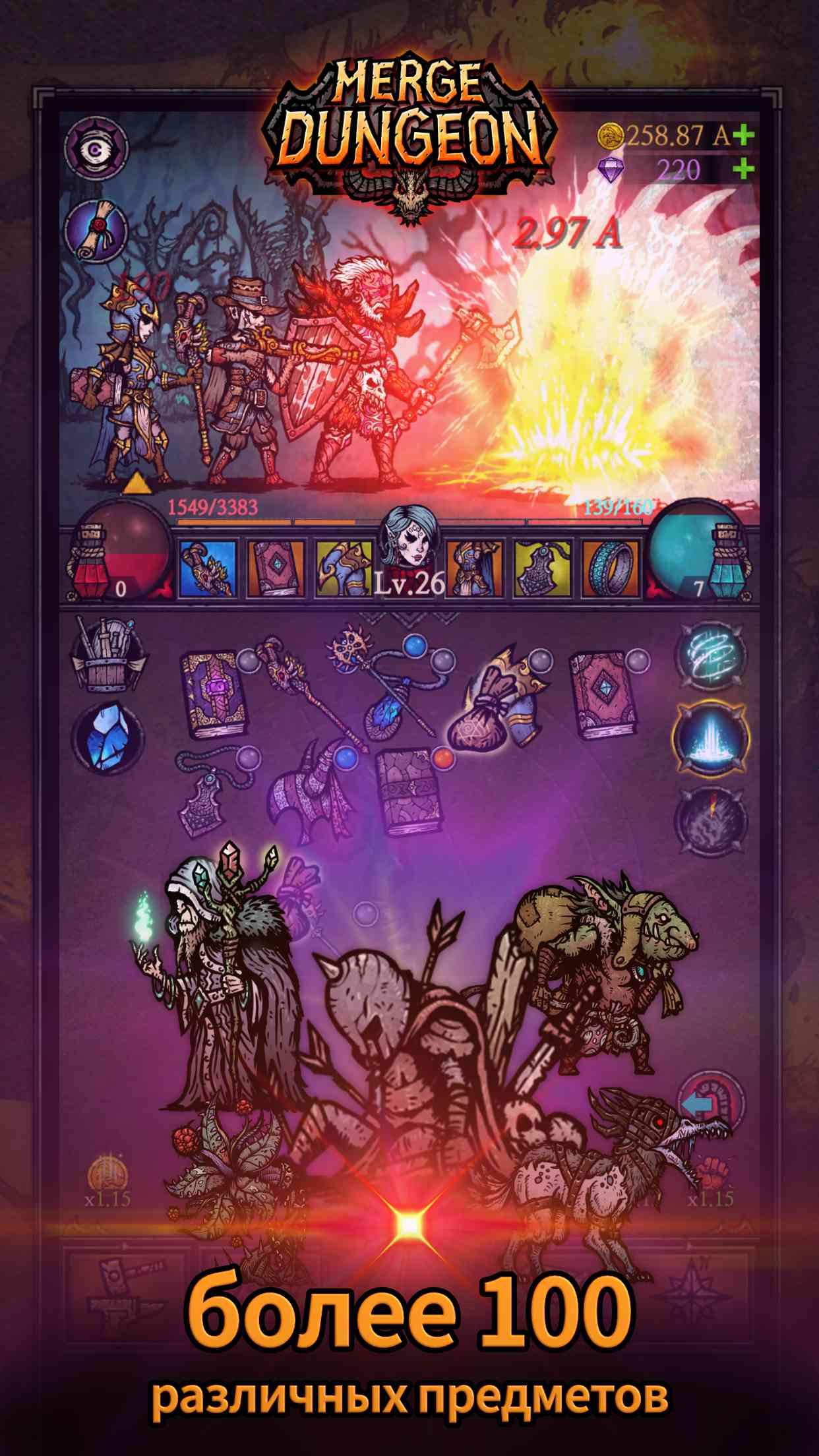 Объединяй предметы и исследуй подземелья! Улучшай своих героев, добывай предметы и участвуй в неожиданных событиях.