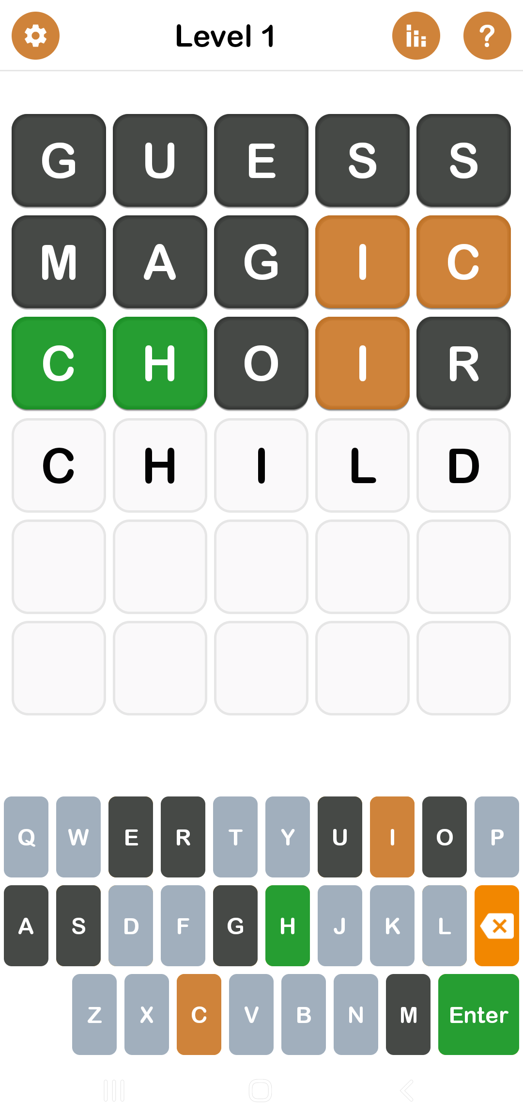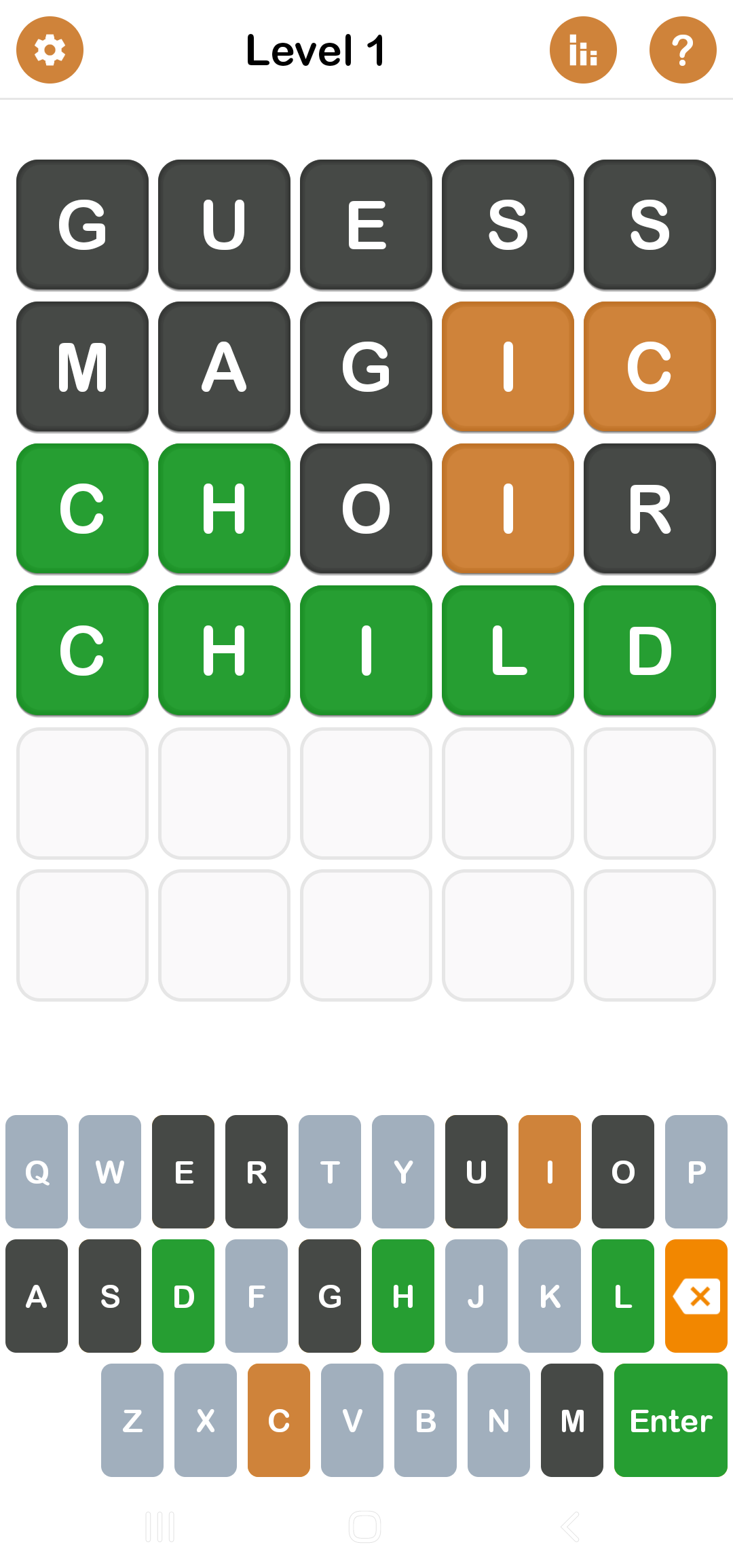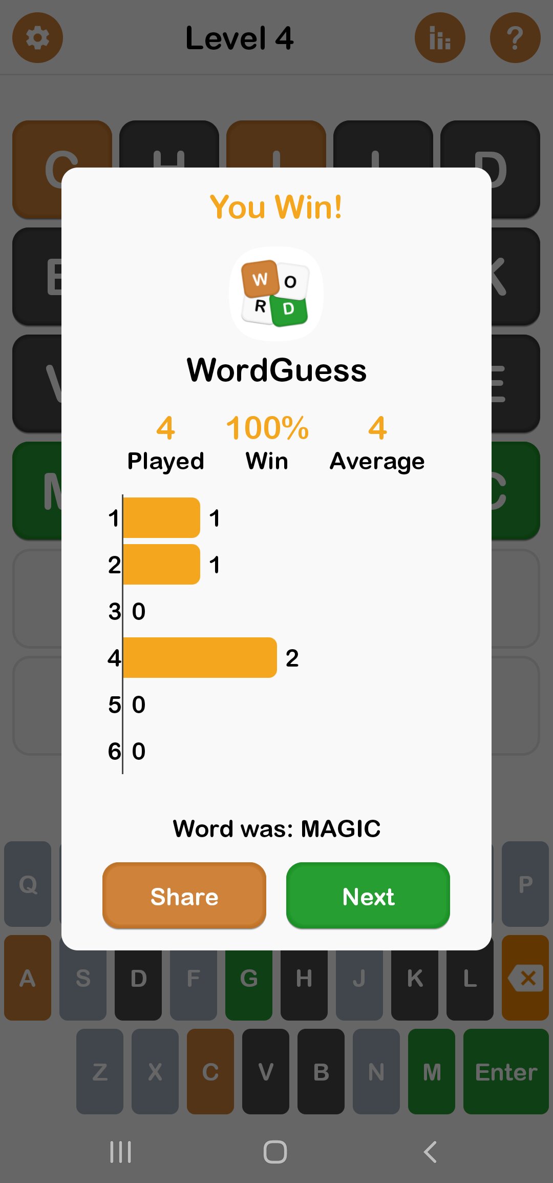 WordGuess — лучший способ начать свой день! Если вы отличный любитель словесных игр, добро пожаловать в наше королевство ежедневных задач WordGuess! Наслаждайтесь простым и красивым дизайном игры WordGuess, а также большим разнообразием уровней и головоломок, которые тренируют ваш мозг и приносят больше удовольствия во время игры!