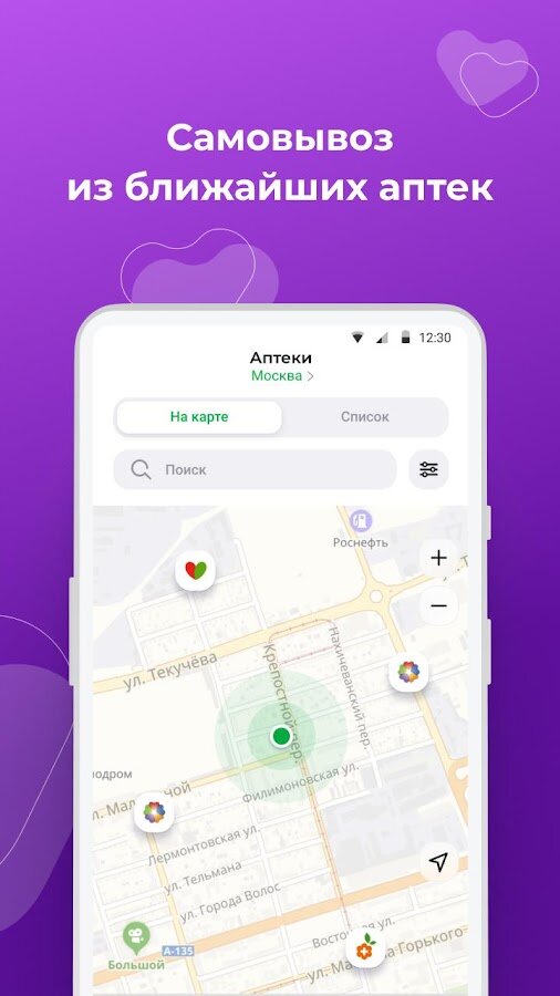- Быстрое оформление заказа. Забронировать товары можно нажатием всего одной кнопки, зная точные цены в аптеках, а забрать заказы – в ближайшей аптеке в удобное для Вас время. Все аптеки удобно отображаются на карте. Также у нас есть услуга “аптека доставка” — получите свое лекарство, не выходя из дома. Лекарства на дом особенно актуальны в настоящее время.