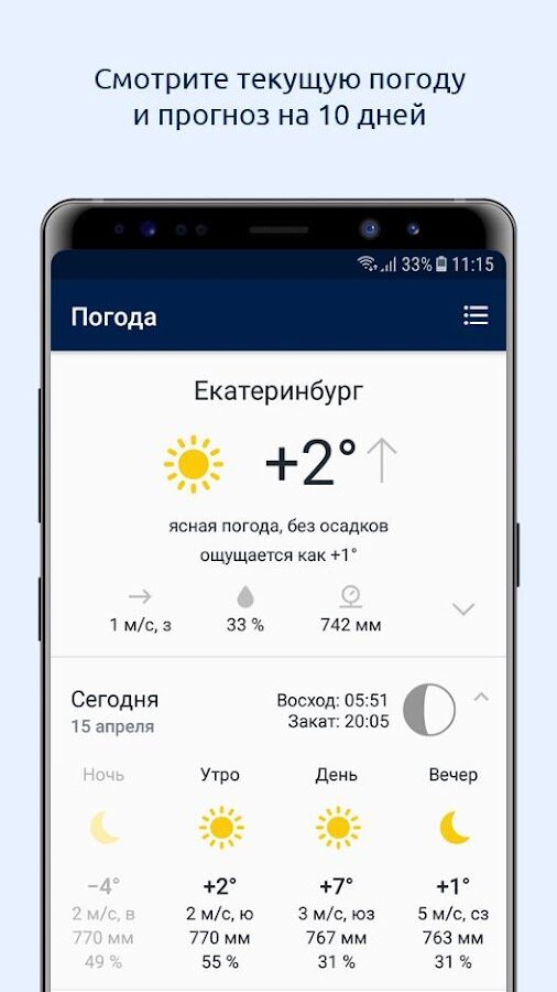 - смотреть текущую погоду и прогноз на ближайшие 10 дней;