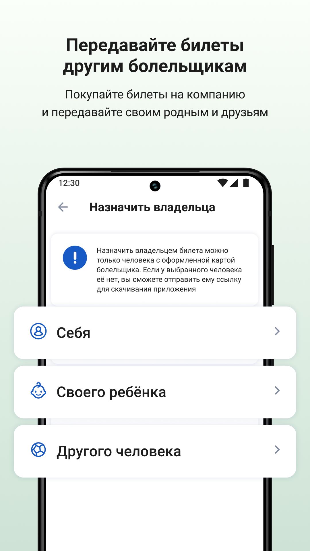 Назначайте билеты на себя и других людей, у которых есть карта болельщика. Создавайте детские билеты без места, привязанные к билету взрослого.