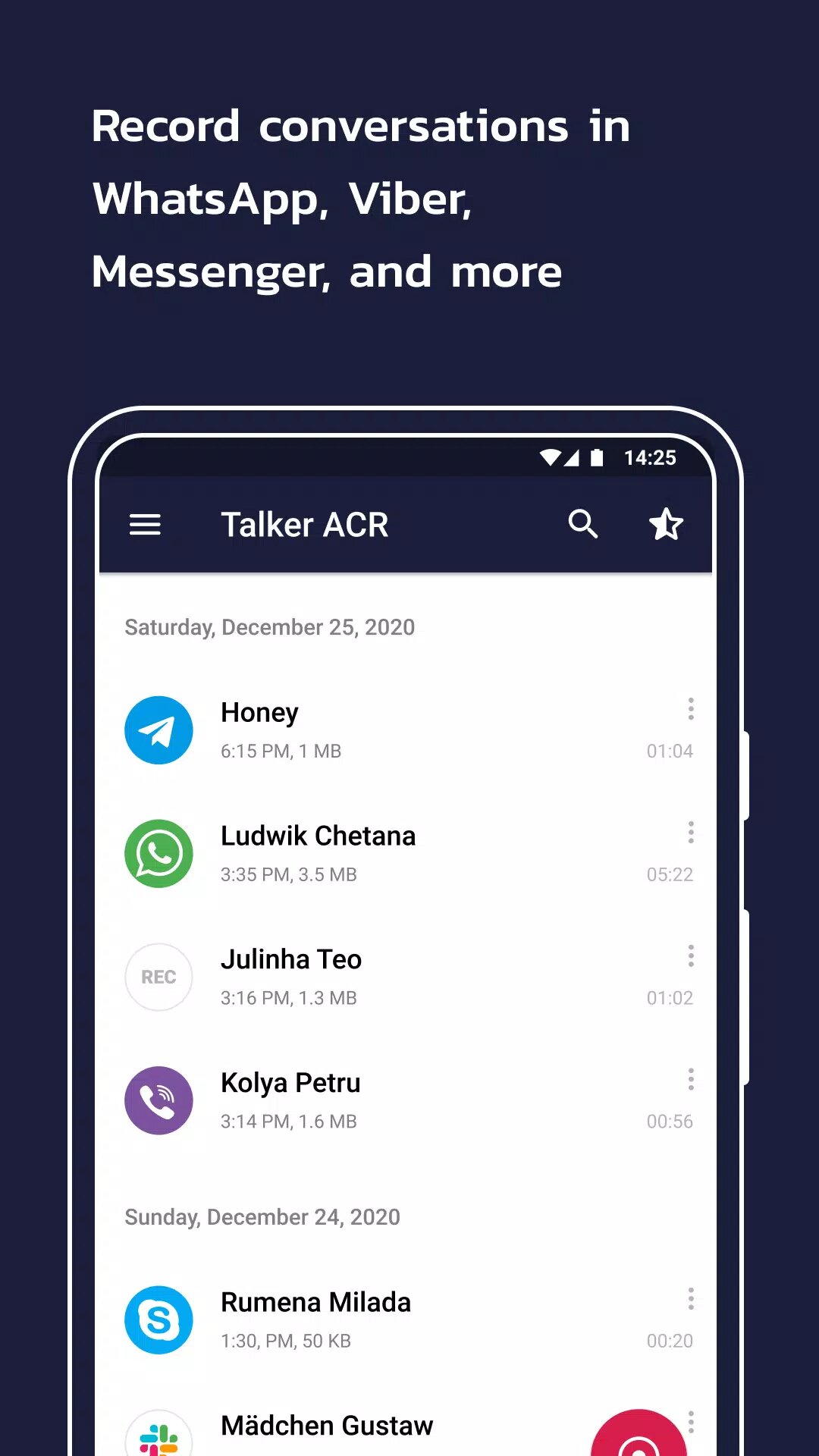 В отличие от других подобных приложений, приложение для записи звонков Talker ACR позволяет записывать звонки в WhatsApp*, а также разговоры в Viber, Skype, Hangouts, Facebook* и других мессенджерах в максимально возможном качестве всего за несколько простых шагов.