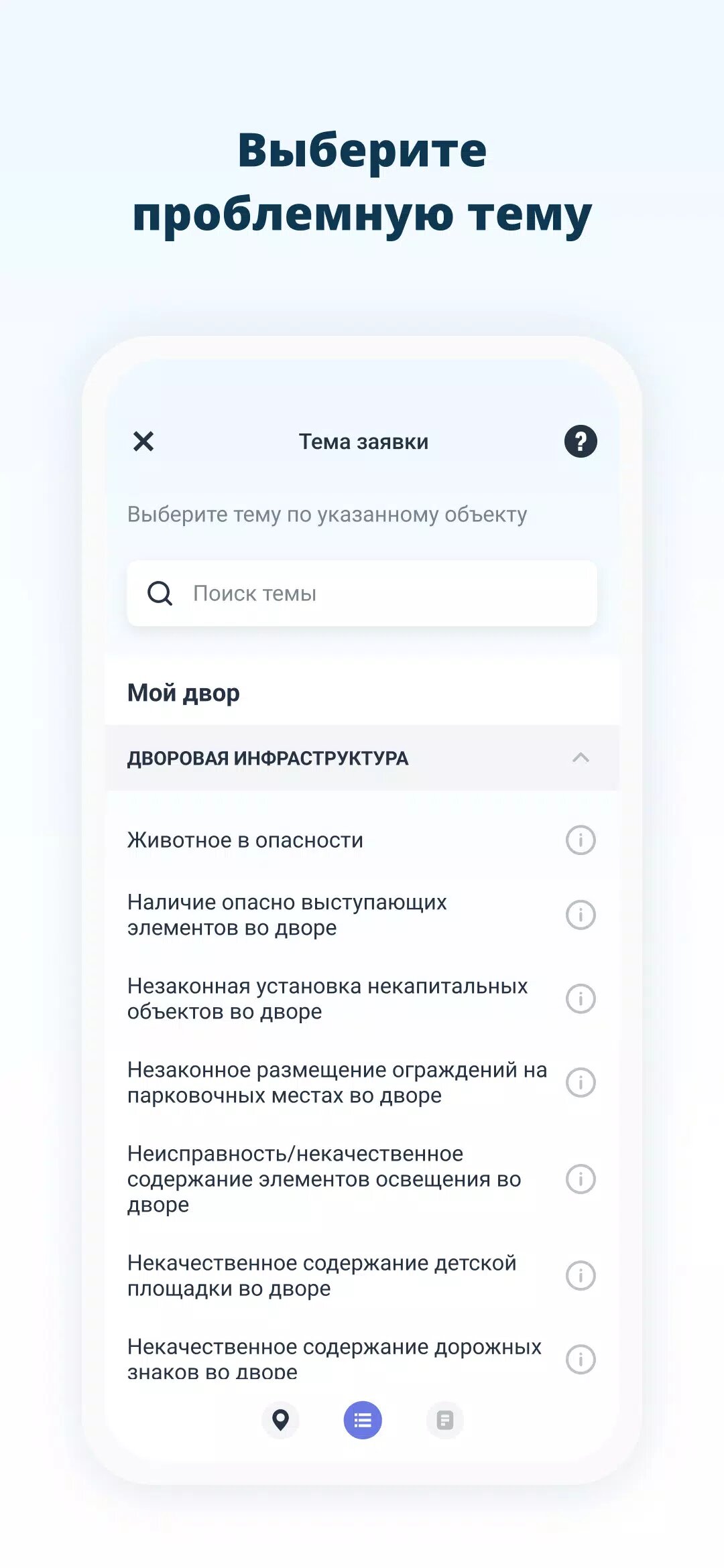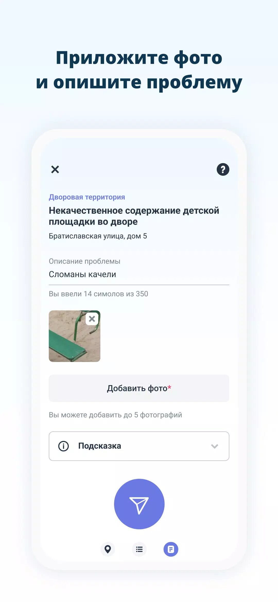 Во дворе вовремя не вывозят мусор? Не работает светофор? Заметили яму на дороге? Сообщите о проблеме, и она не останется без внимания!
