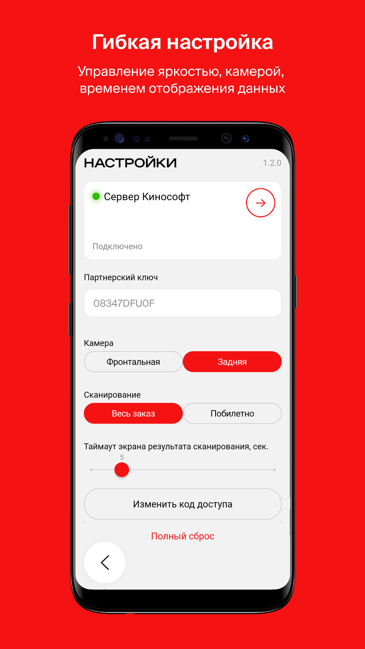 - регулировать яркость камеры и время показа результатов поиска заказа;