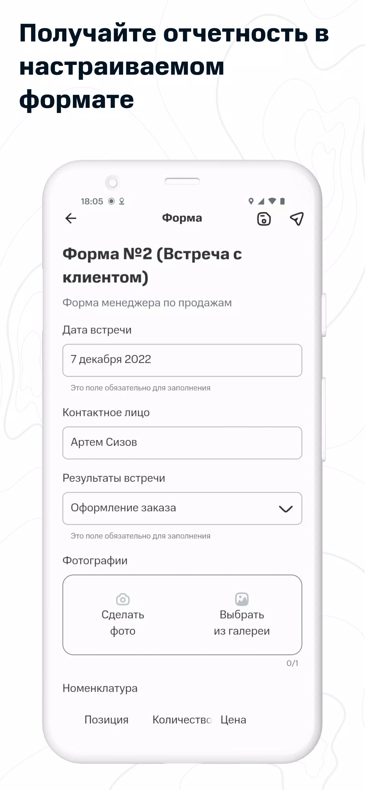- создание и получение мобильных форм отчетности по факту выполнения задачи или посещения объекта,