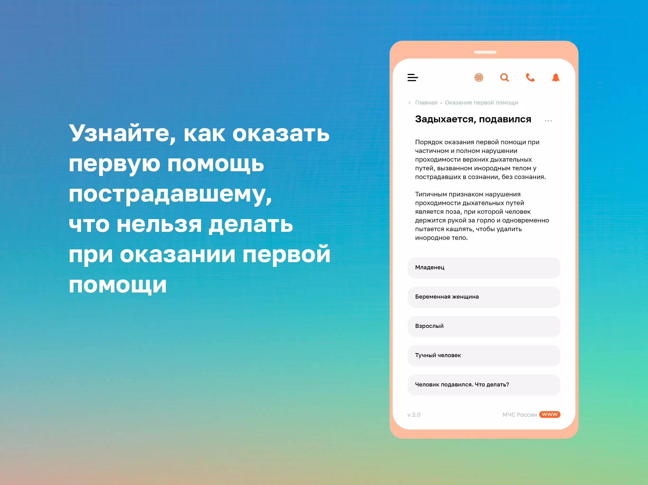В разделе «Что делать?» Вы сможете найти краткие инструкции, находящиеся всегда под рукой, с четкой последовательностью действий и правил поведения в экстренной ситуации. В разделе реализован голосовой помощник, озвучивающий текст статьи в случае отсутствия возможности держать телефон или прочитать информацию самостоятельно.