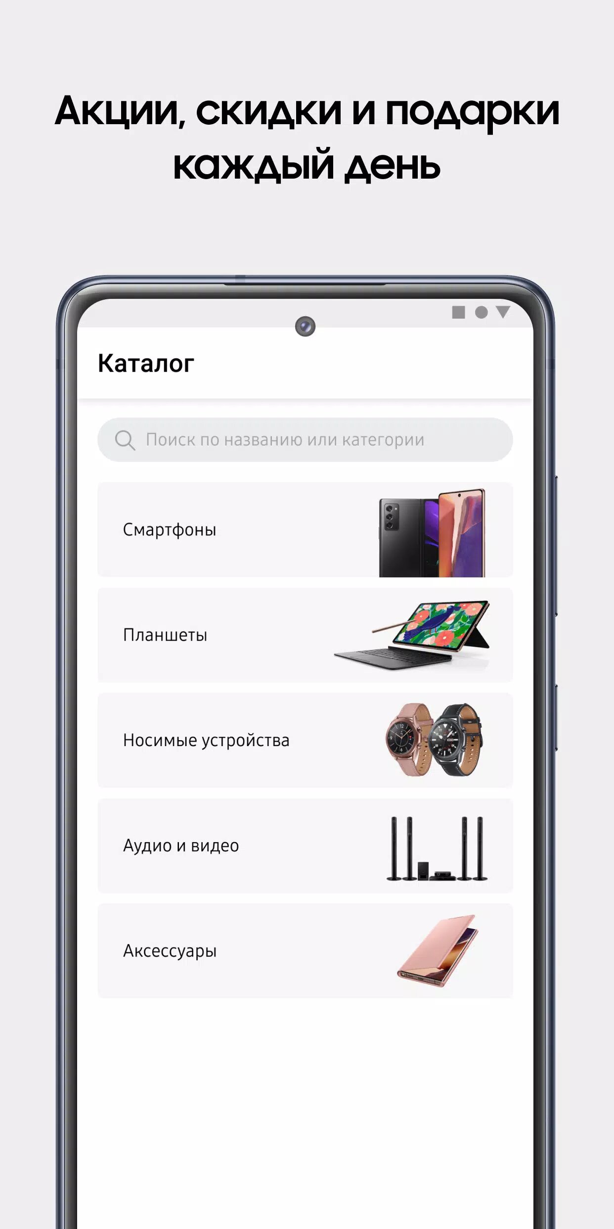 - Первыми узнавать о скидках, акциях и предзаказах, сравнивать новые и популярные устройства, знакомиться с характеристиками любой техники, будь то телевизор, телефон, умные часы Galaxy Watch, планшет или наушники;