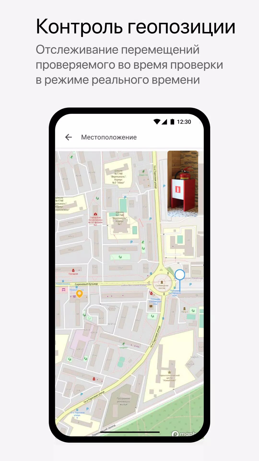 Карта в приложении позволяет просматривать во время ВКС расположение проверяемого участника и отслеживать его удаленность от объекта проверки. Благодаря функции отслеживания подмены геолокации, пользователи получат уведомления если что-то пойдет не так.