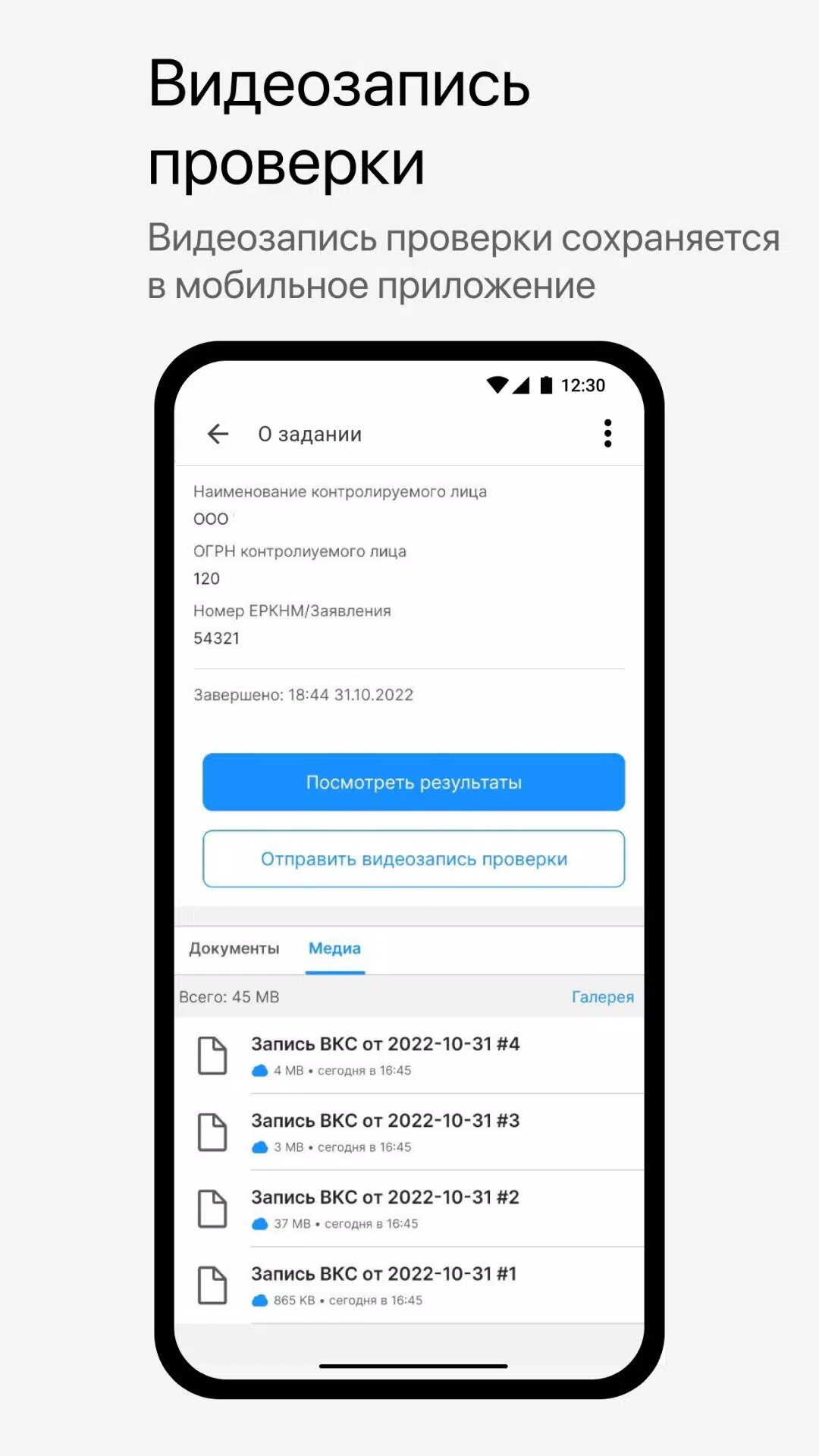 После проведения мероприятия с ВКС пользователь может посмотреть видеозапись проверки в приложении и отправить видеозапись на почту. Заполненные проверочные листы так же доступны в приложении и ими можно поделиться через почту и мессенджер.