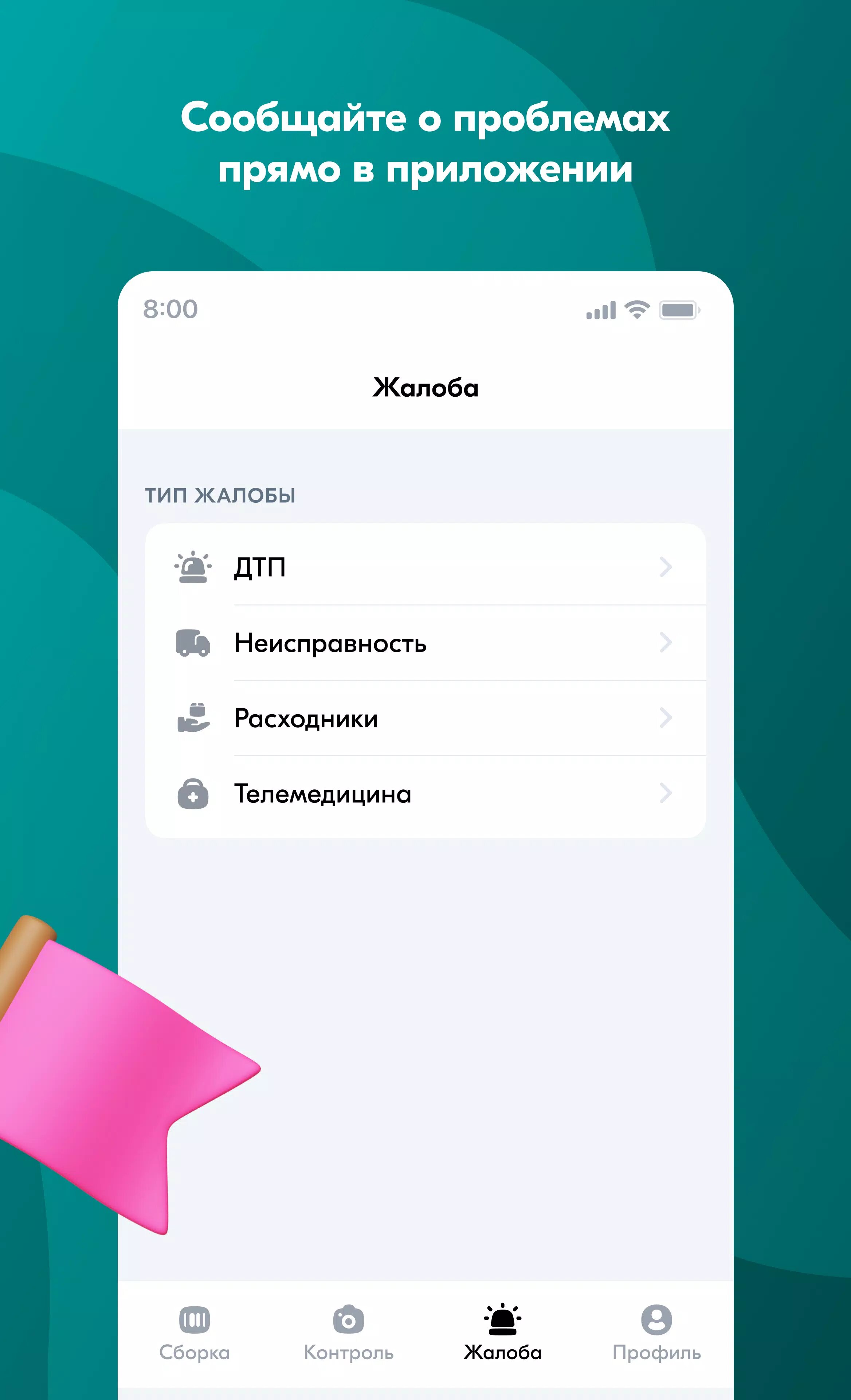 Курьеры на корпоративных транспортных средствах имеют удобную возможность через приложение сообщать о ДТП, неисправностях и фиксировать другие жалобы относительно автомобиля.
