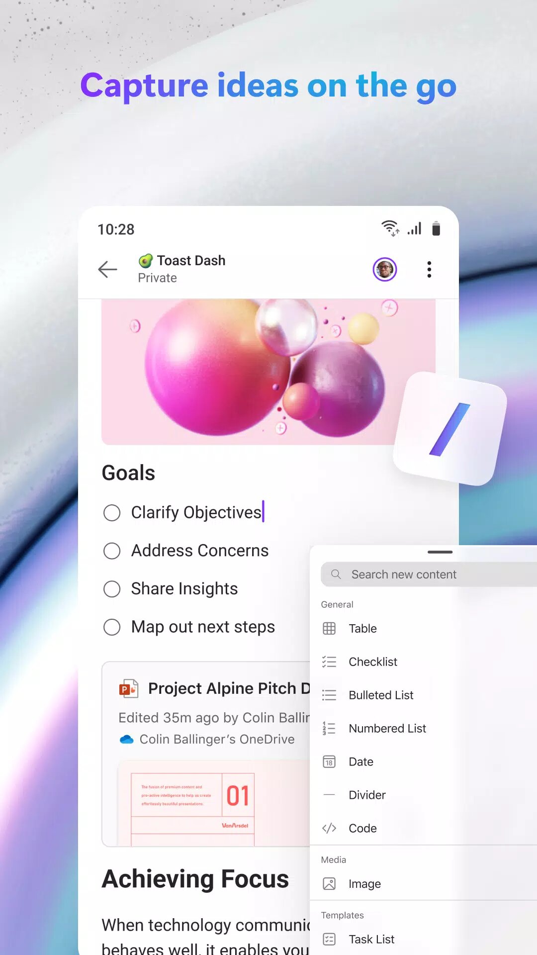 - Записывайте идеи, создавайте списки задач и вставляйте фотографии на страницы Loop, чтобы выразить свои мысли.