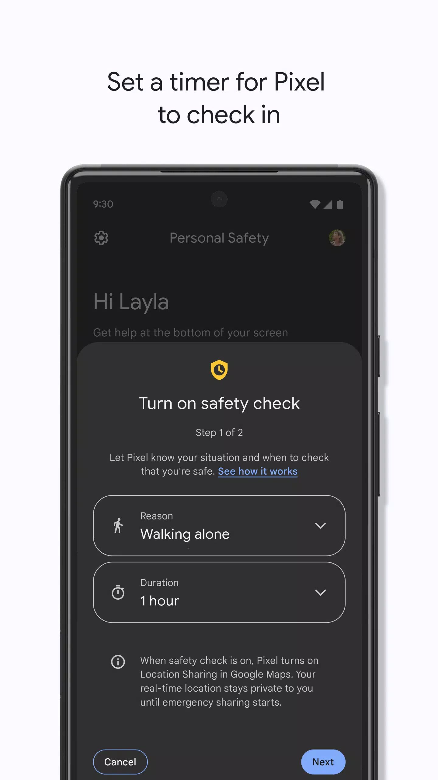 - Проверка безопасности. Вы можете запланировать проверку безопасности, чтобы телефон периодически спрашивал, всё ли у вас в порядке. Если вы не ответите за отведенное время, будет запущена отправка данных в экстренных случаях. Функция также работает с Google Ассистентом.
