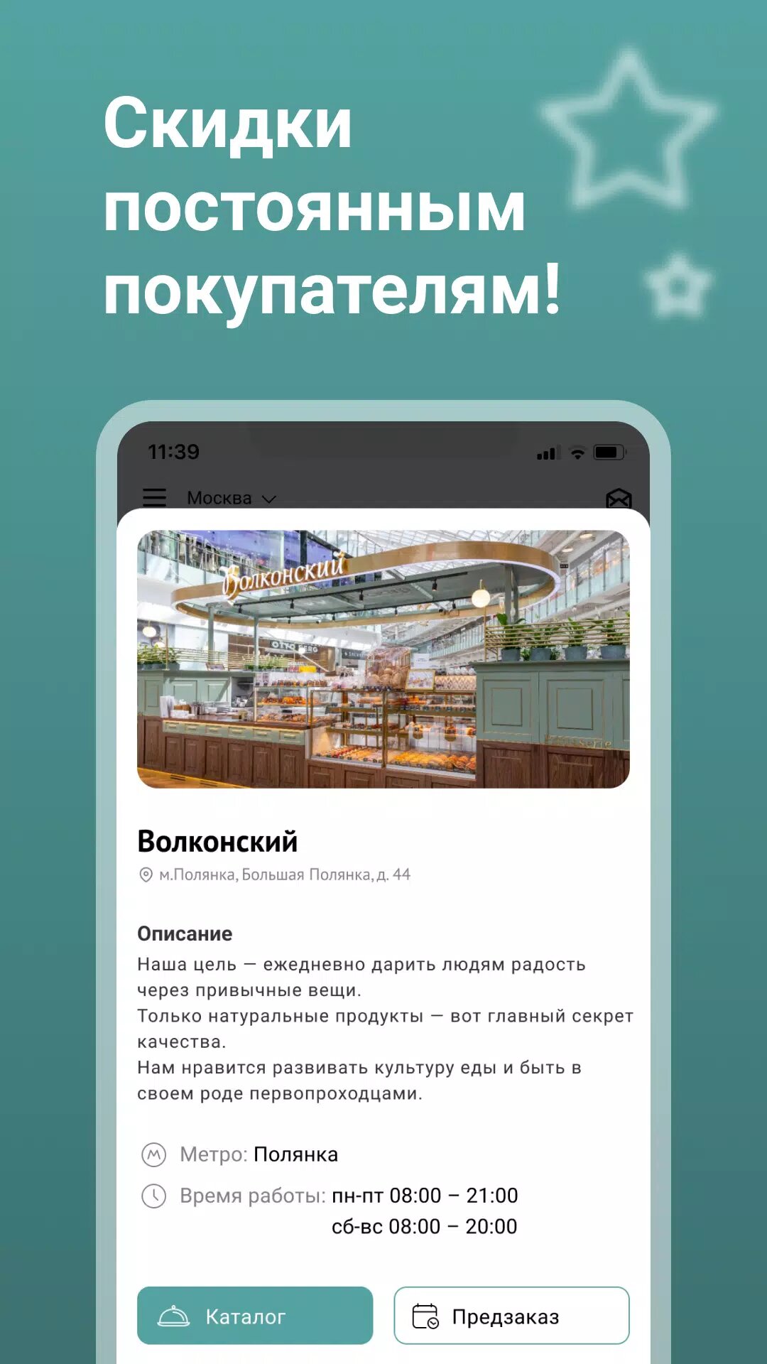 Волконский – сеть традиционных кафе-кондитерских с парижским акцентом. Закажите доставку нашей продукции на дом или в офис в нашем бесплатном мобильном приложении. Пару кликов и свежеиспеченный хлеб уже отправляется к Вам.