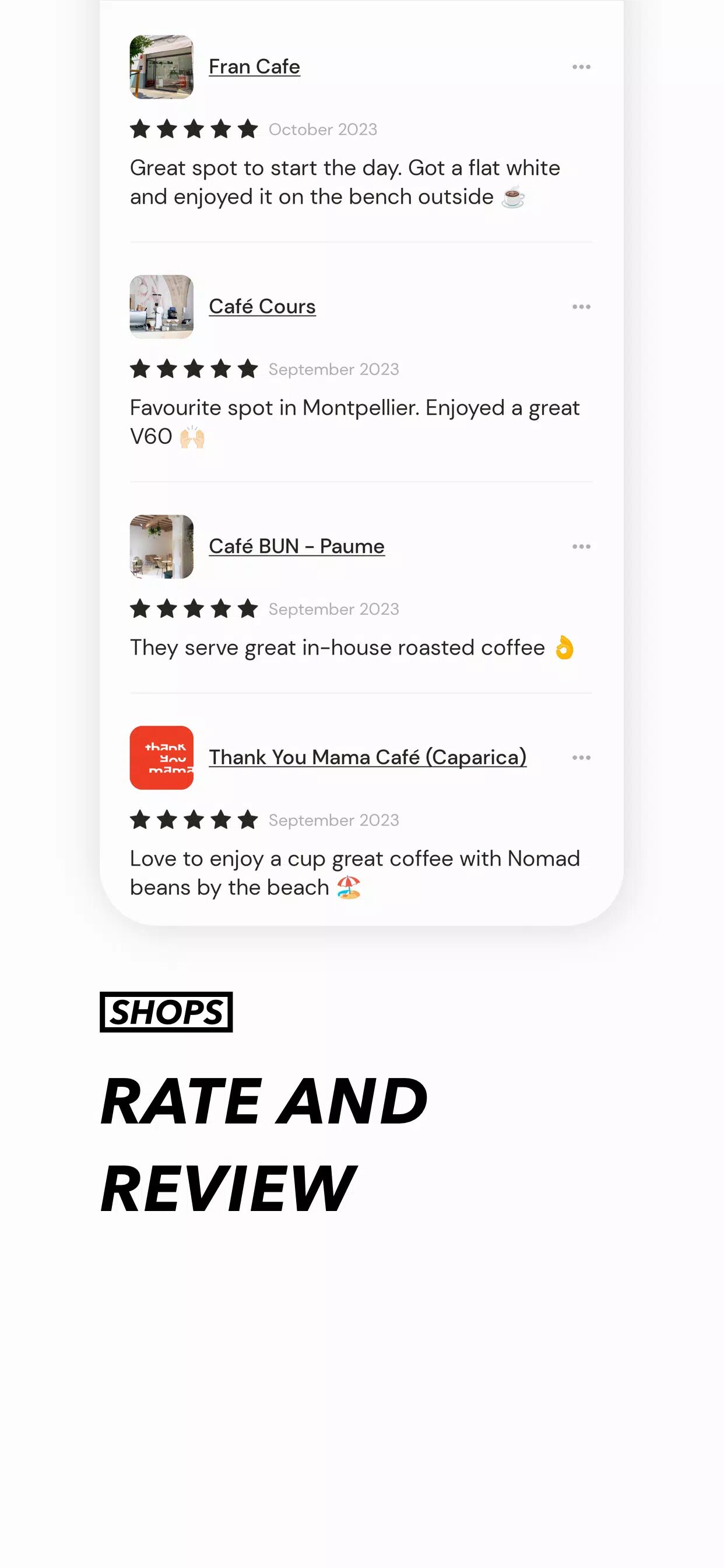 ⭐️ Рейтинги и обзоры. Воспользуйтесь мудростью кофейного сообщества и откройте для себя кофейни с самым высоким рейтингом. Читайте подлинные отзывы пользователей, делитесь своим опытом и принимайте обоснованные решения о своих кофейных приключениях.