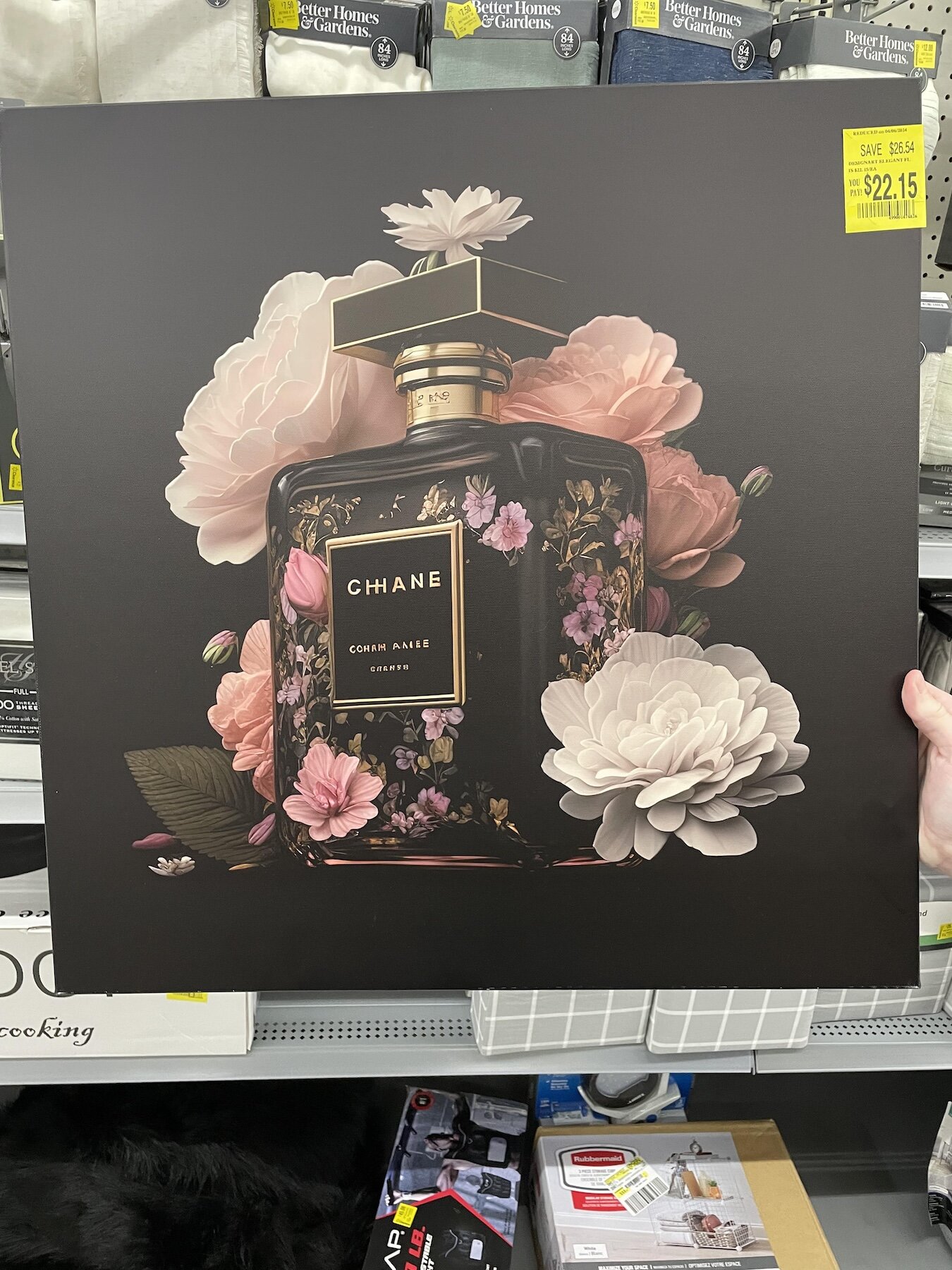 Пользователь заметил на полке Walmart картину за 22 долларов, которая явно «нарисована» при помощи искусственного интеллекта. Это заметно, если присмотреться к буквам в названии парфюма, мелких деталях декора и даже форме бутылки. При этом на ценнике указано «Дизайнерское искусство», а вот метки про ИИ нет.