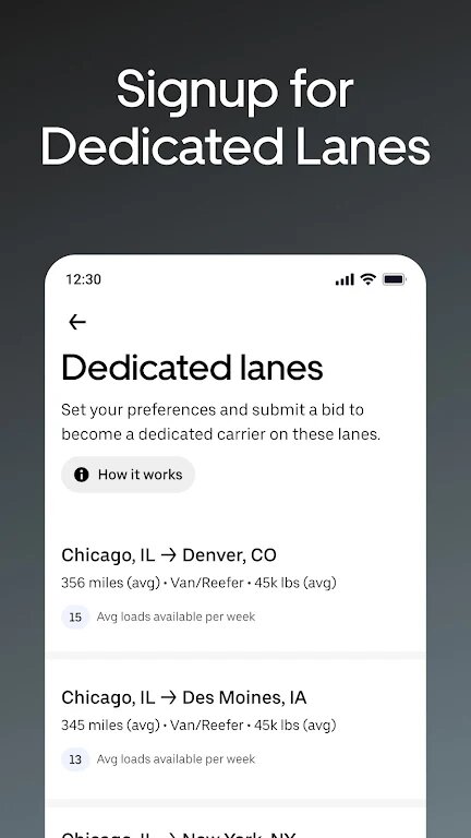 Uber Freight дает перевозчикам контроль с помощью мгновенного бронирования погрузки, предварительной информации о загрузке и объектах, а также инструментов управления бизнесом. Это одно приложение для каждой перевозки.