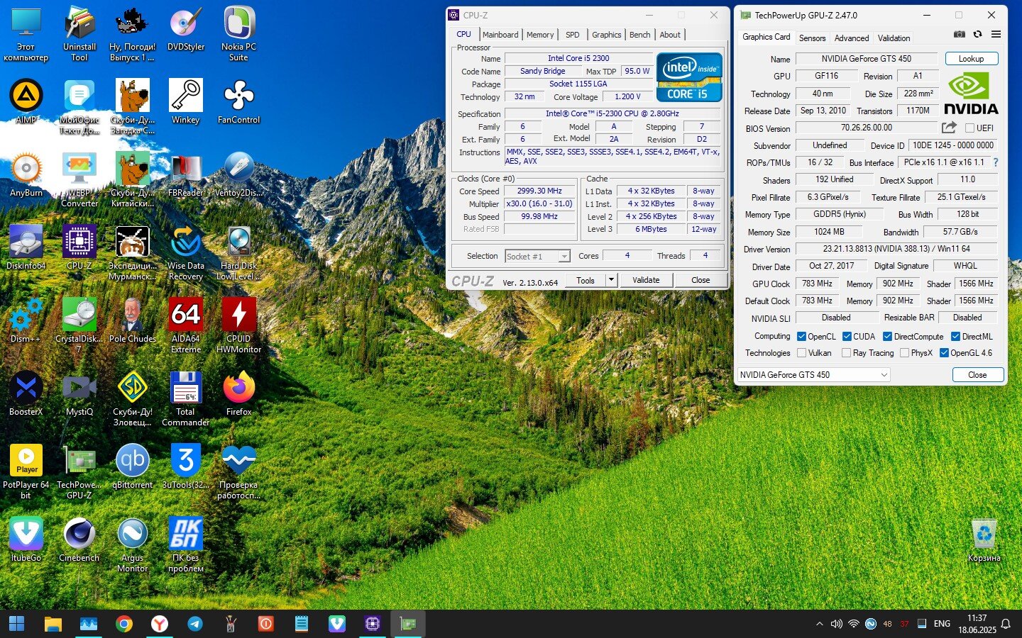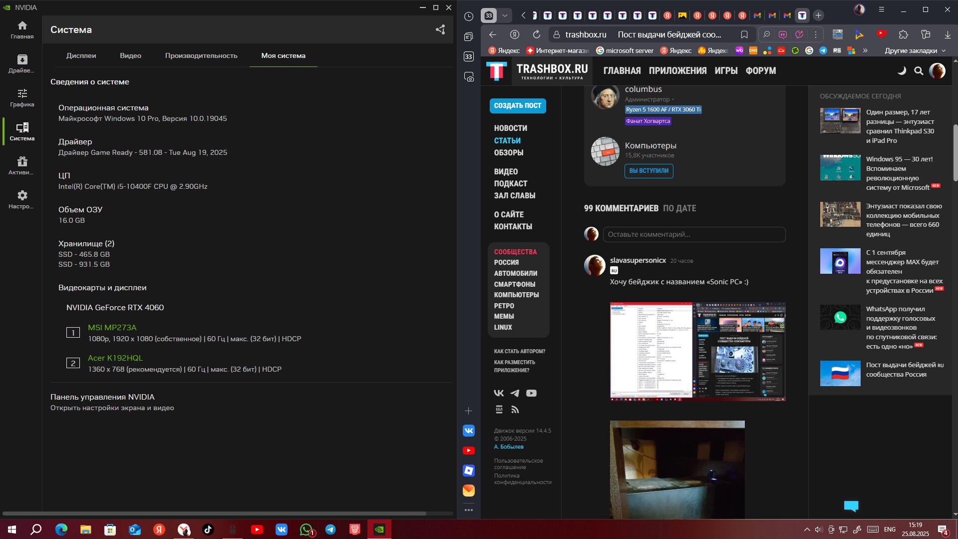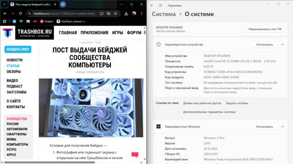 - Фотография или скриншот экрана с открытым на нём Трешбоксом и окном характеристик компьютера.