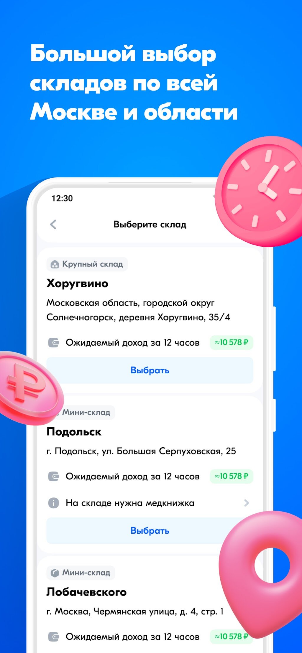 - Выбирайте задания по желанию и возможностям: можно размещать новые товары на складе или собирать заказы для доставки.