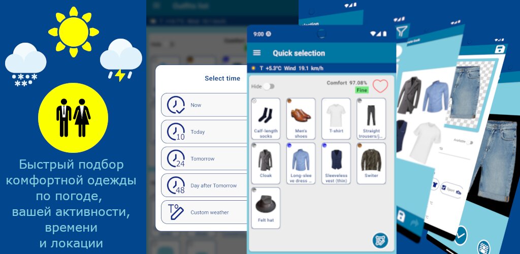 Приложение поможет быстро и точно подобрать комплетк одежды из вашего гардероба по погоде на улице в конкретное время в любом месте земного шара.