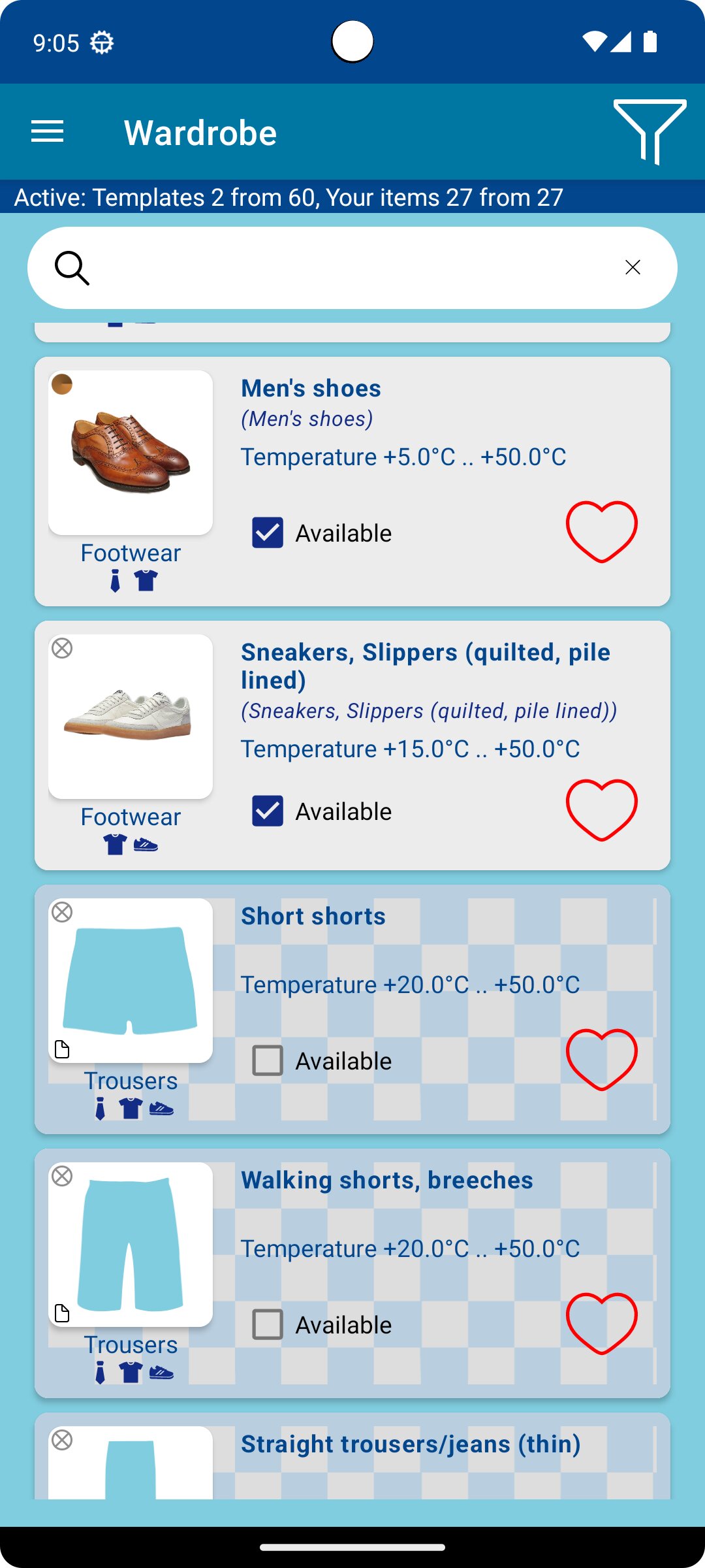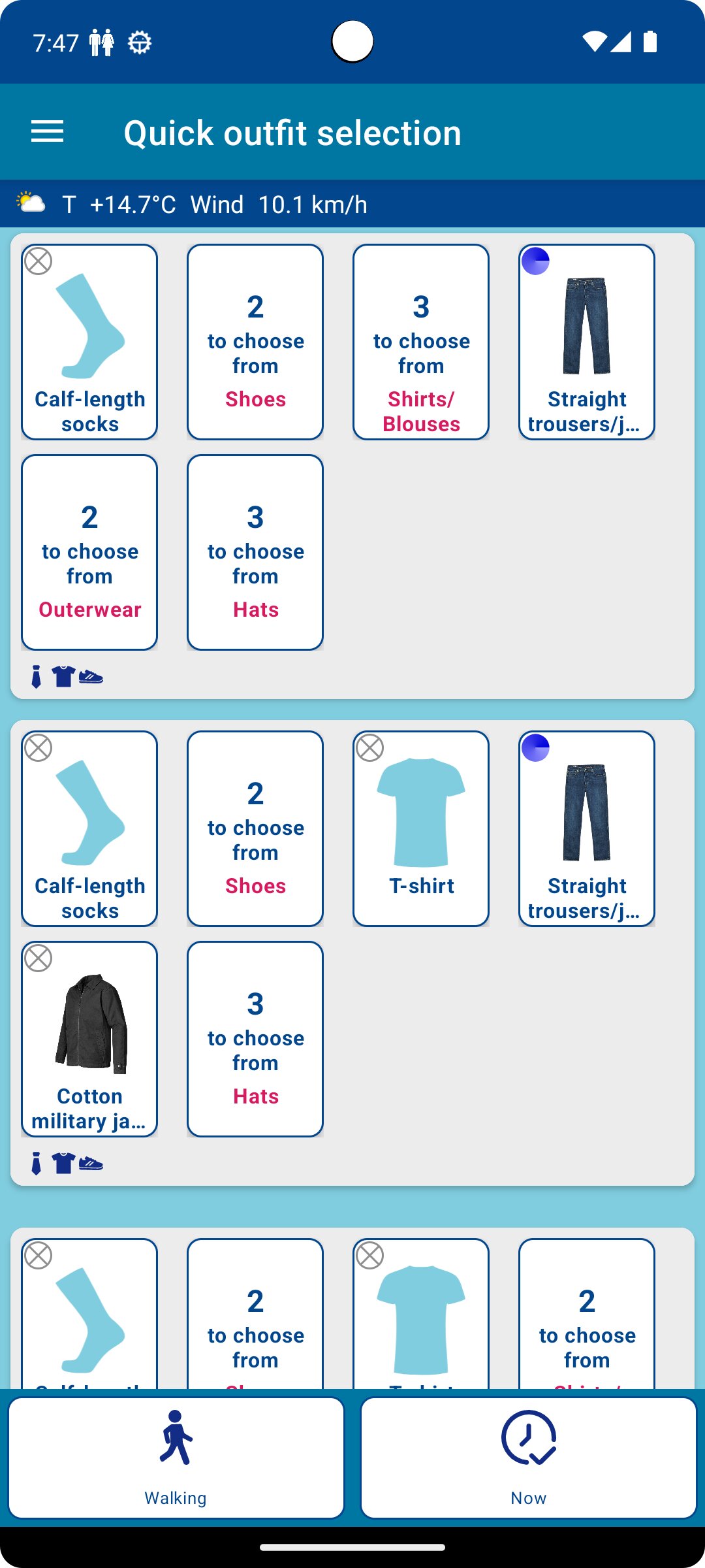 На основе вашего гардероба приложение рассчитывает подходящие комплекты вещей в которых вам будет максимально комфортно заниматься любой деятельностью при указанной погоде. Подбирайте быстро и удобно, автоматически и с ручным подбором.