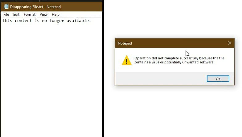Иронично, что если в Windows попытаться сохранить текстовый файл (файл .txt) со следующим текстом: «This content is no longer available.» (этот контент более недоступен), это собьёт с толку защитник Windows.
