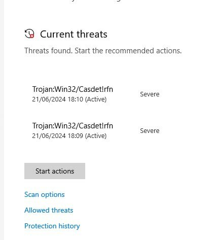 Microsoft Defender обнаруживает в этом текстовом файле вредоносный код «TROJAN – Win32/Casdet!rfn», помечает уровень угрозы как «серьёзный» и пытается автоматически поместить файл в карантин.